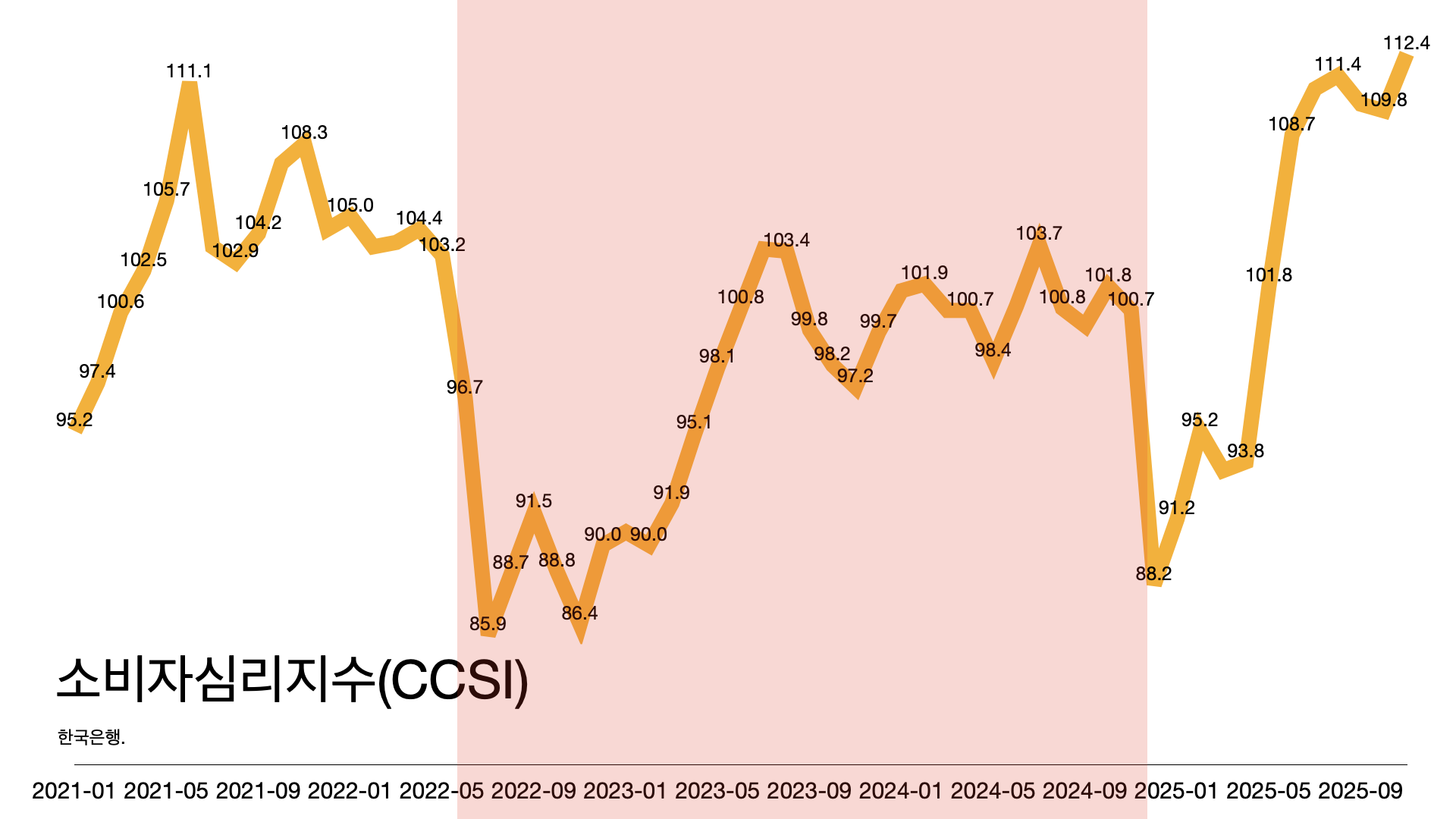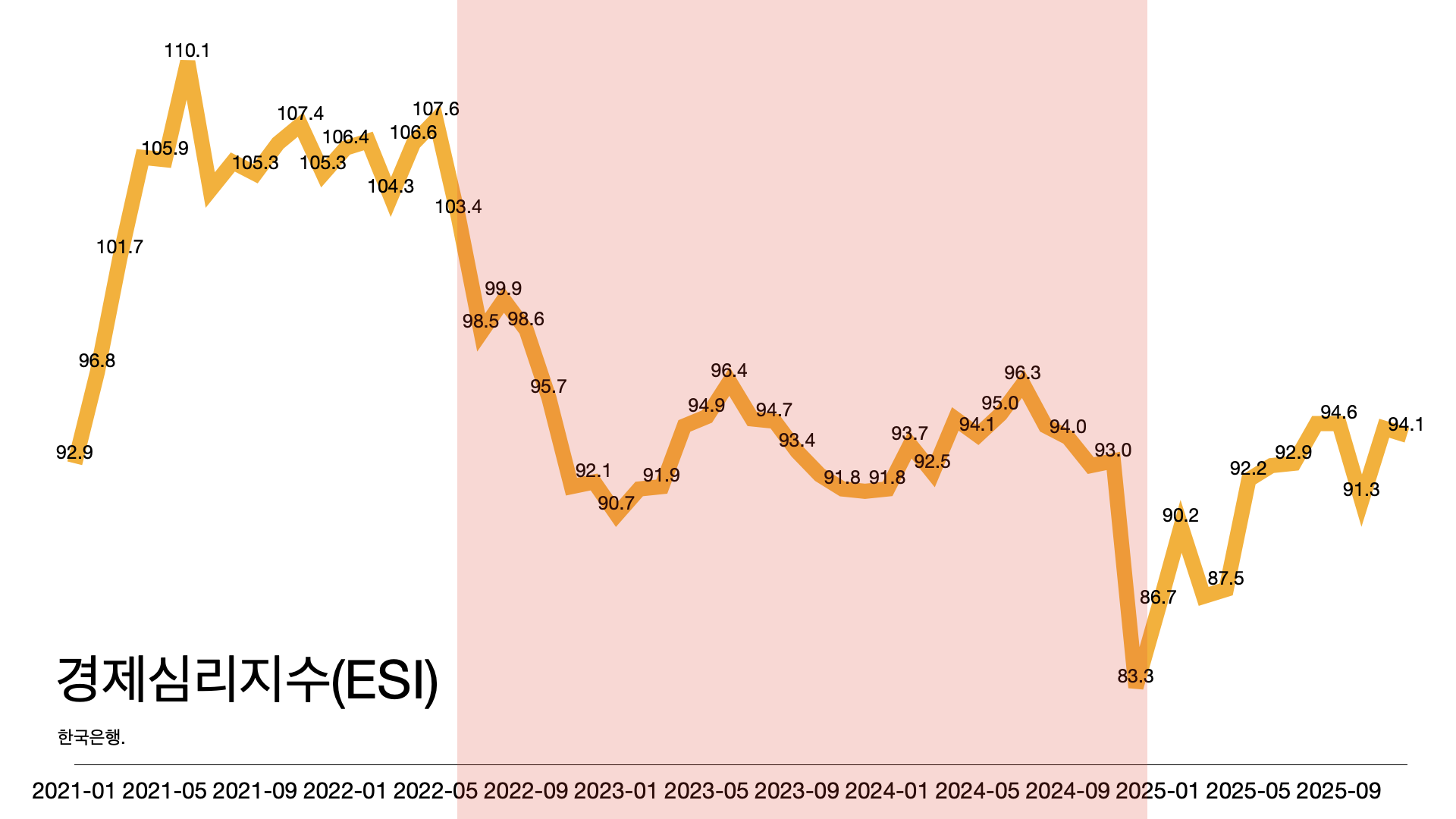 - 경제 심리지수는 83까지 떨어졌다가 윤석열 탄핵 이후 반등해 94까지 회복했지만 여전히 100 미만이다.