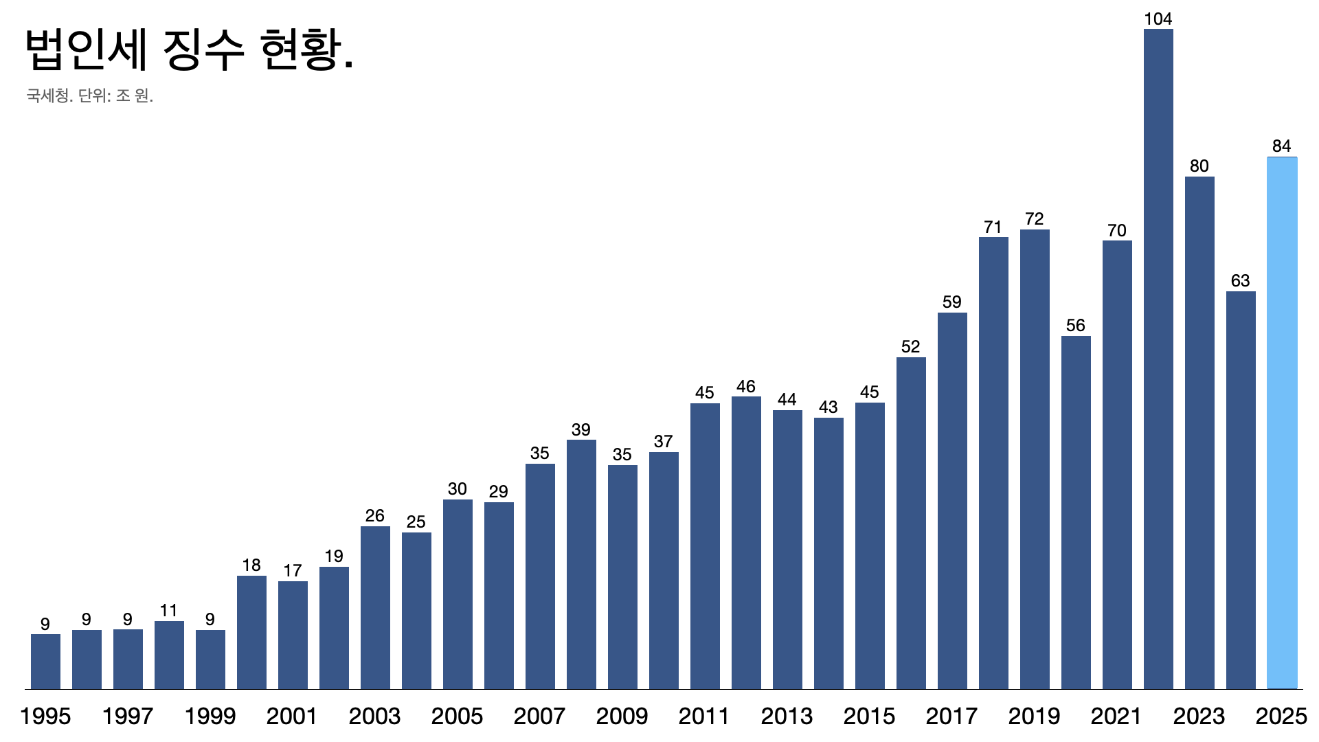 - 법인세를 1%포인트 깎아줬더니 2022년 104조 원에서 2023년 80조 원으로 줄었다.