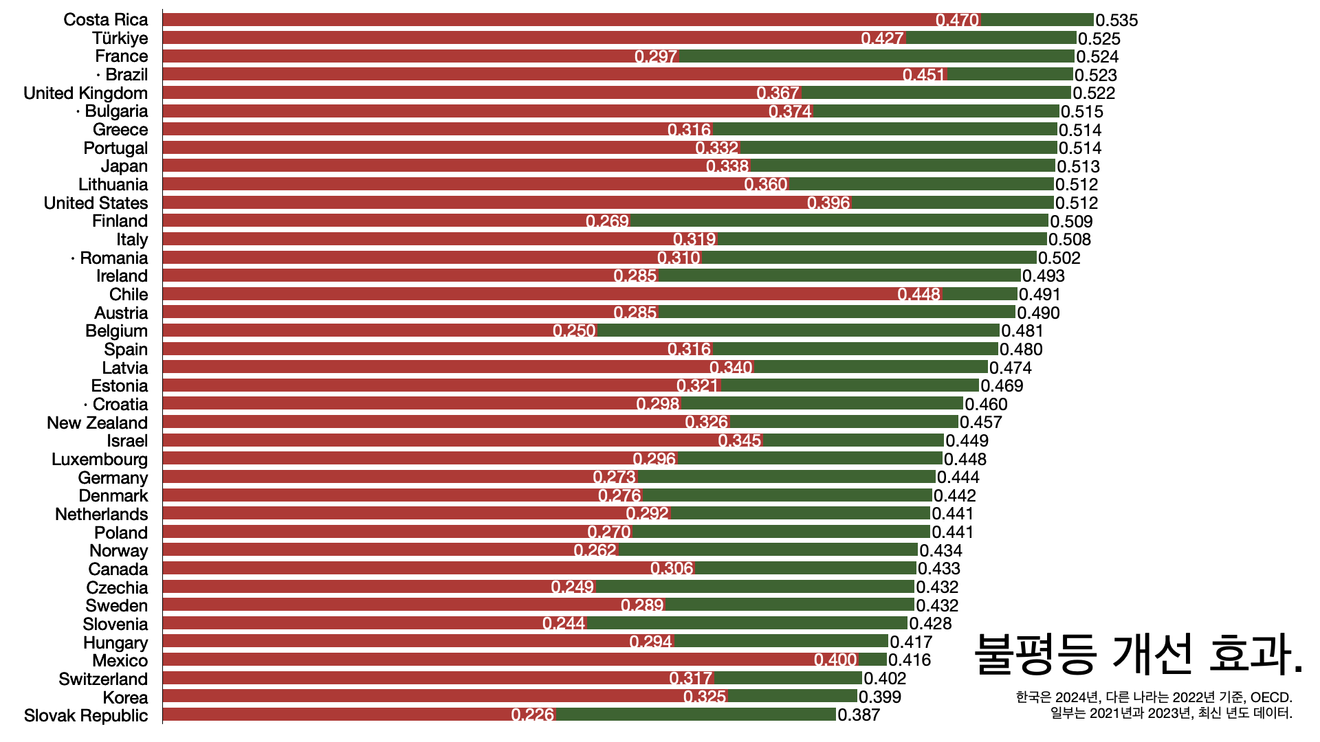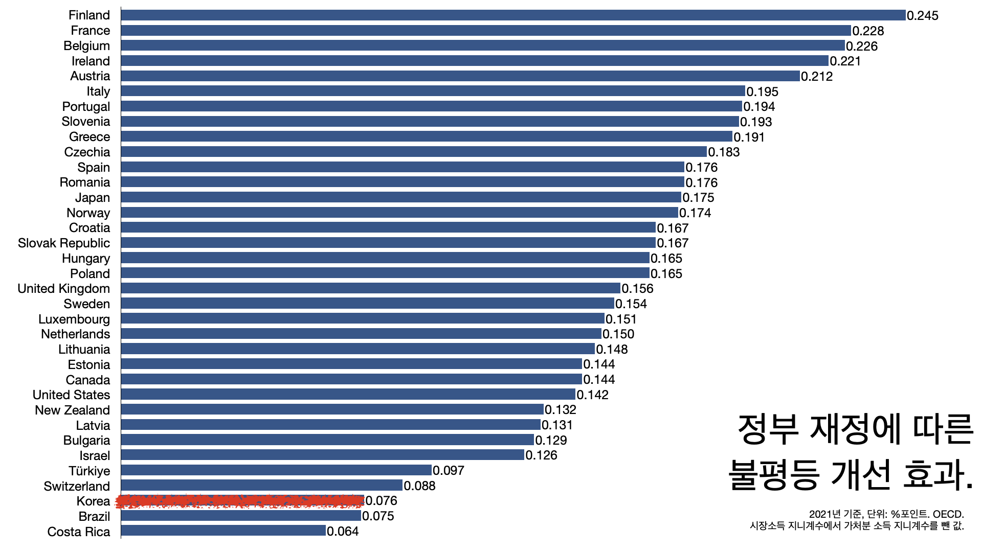 - 지니 계수 개선 효과가 OECD 35개 나라 가운데 33위다.