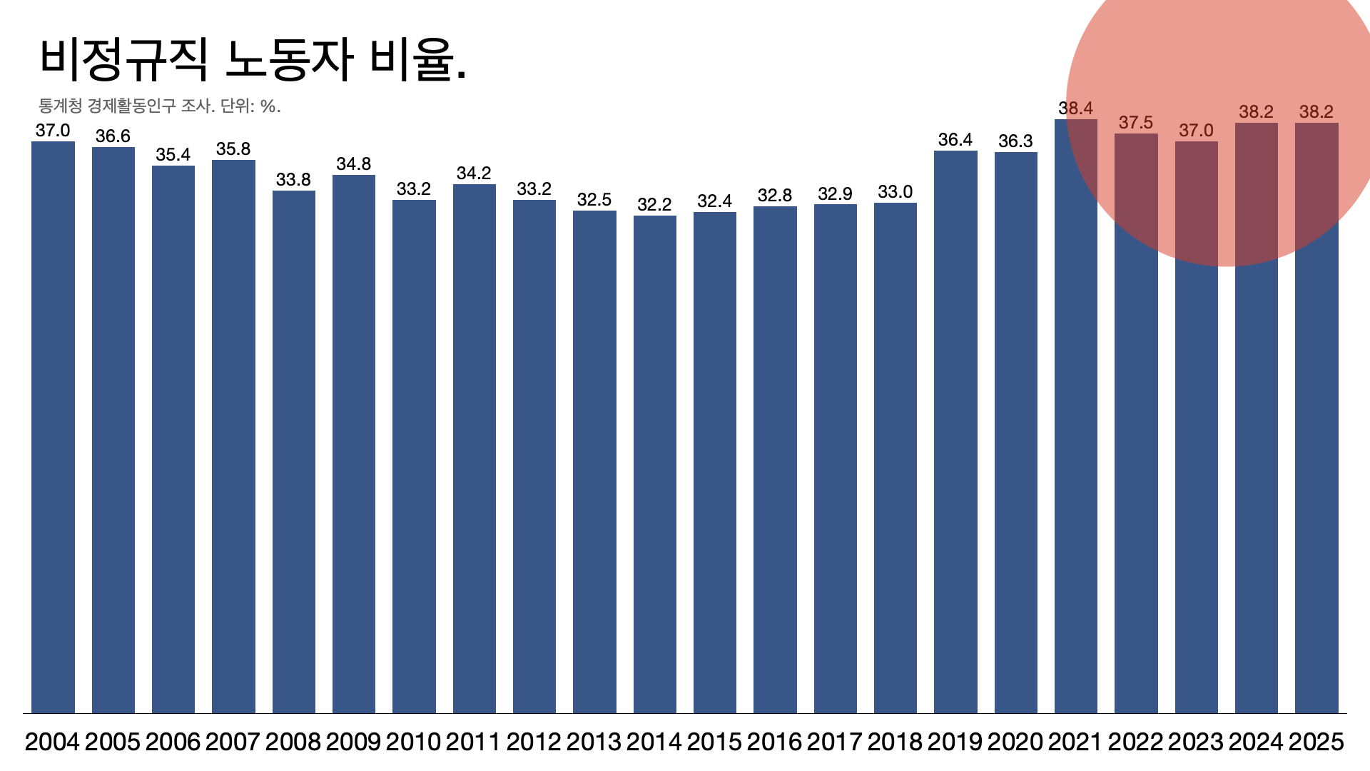 - 비정규직 노동자 비율이 치솟았다. 지난해 38.2%, 올해도 38.2%다. 더 늘어나지는 않았지만 여전히 역대 최고 수준이다.