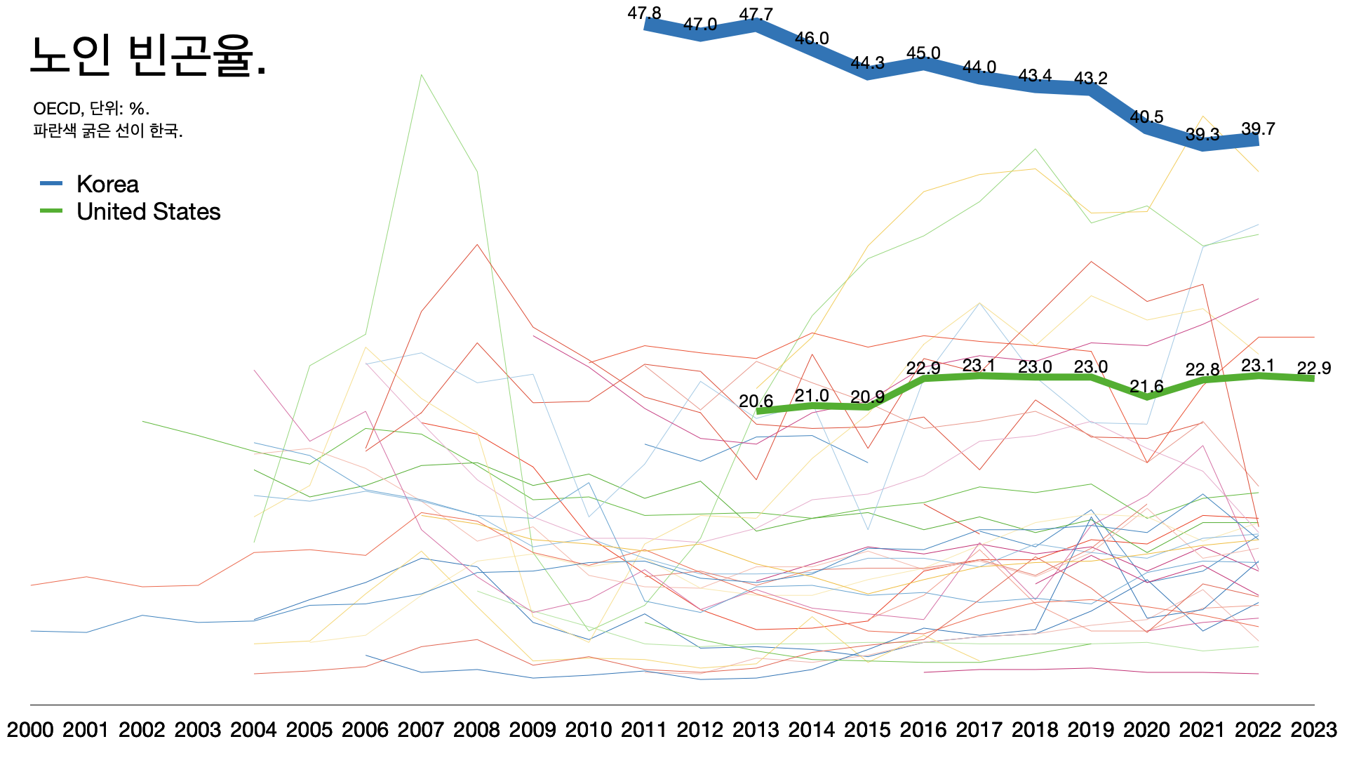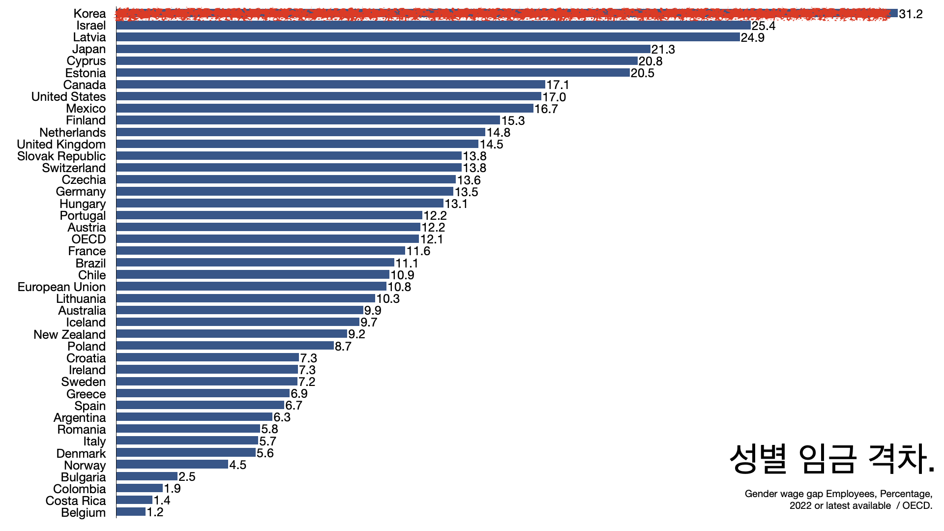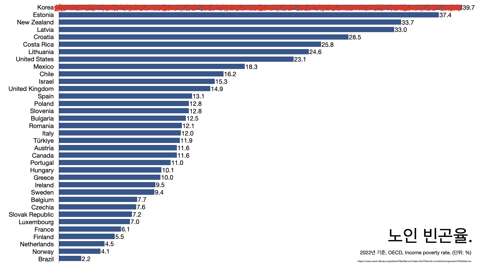- 한국의 노인 빈곤율은 OECD 압도적인 1위다. 성별 임금 격차도 압도적인 1위다.