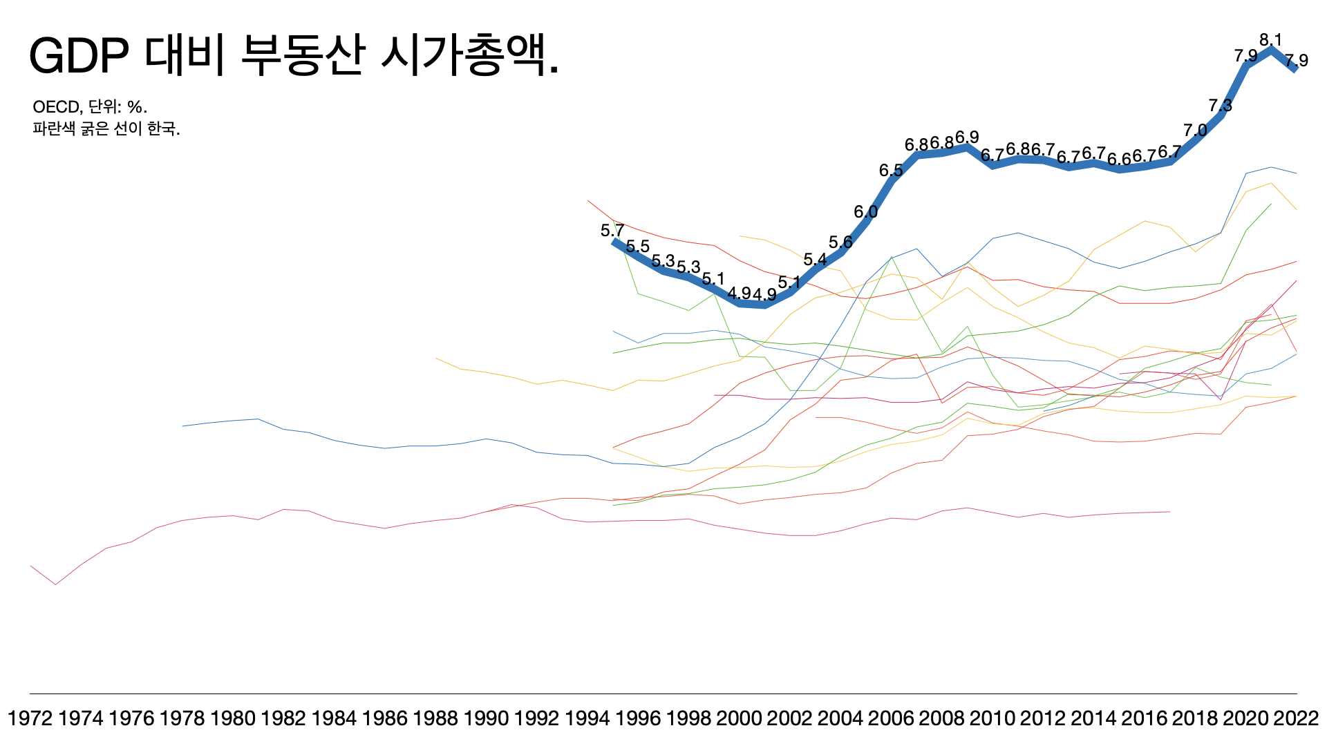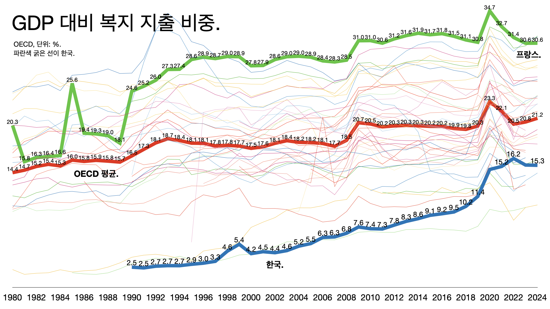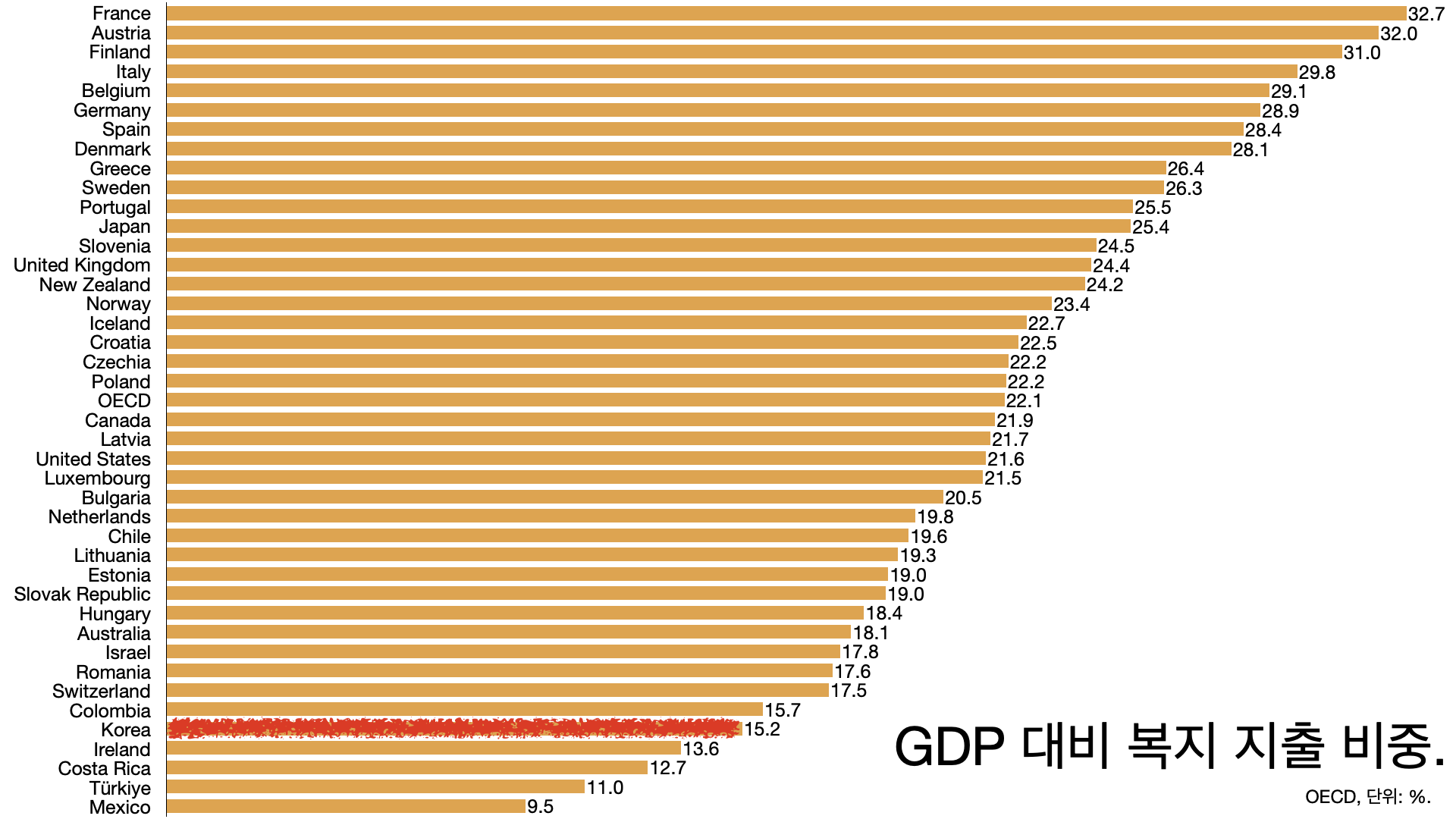 - GDP 대비 복지 지출 비중은 OECD 평균이 21%인데 한국은 15%다.