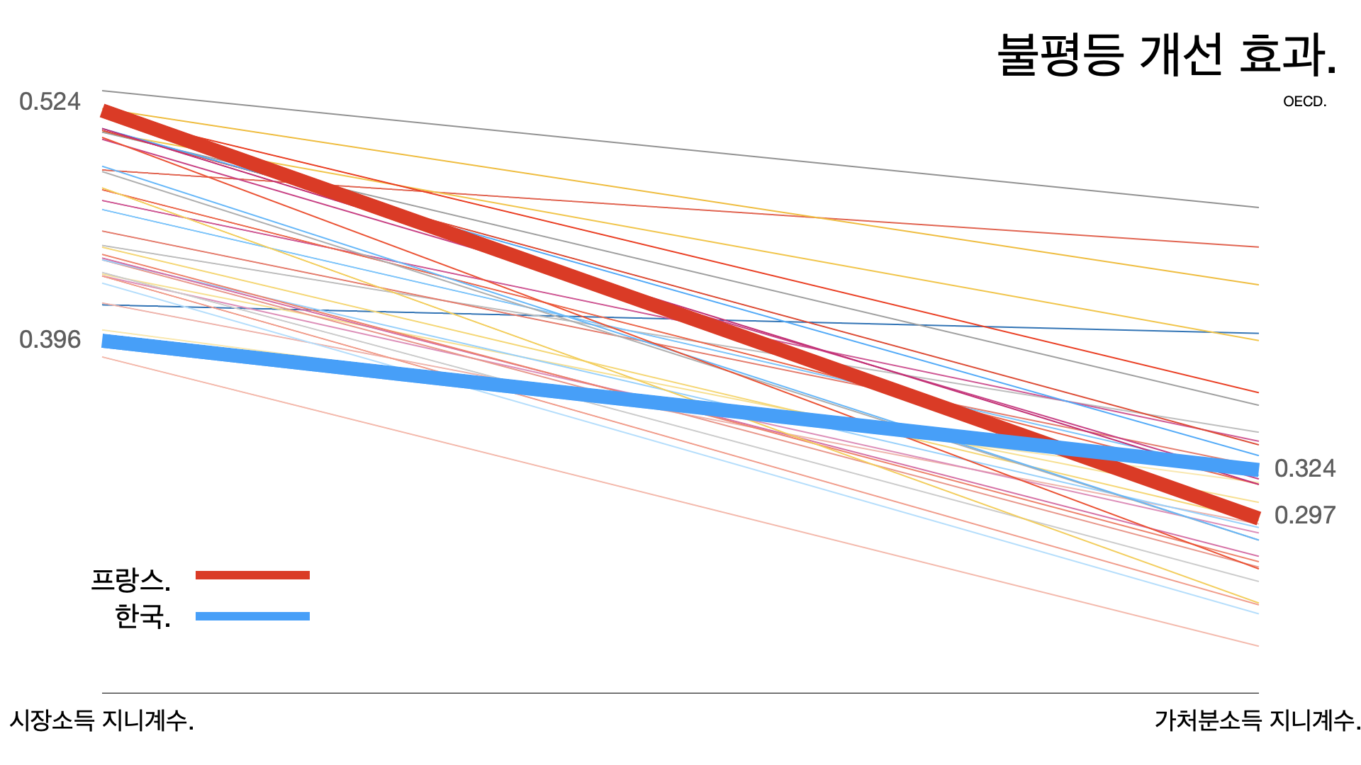 - 시장 소득 기준으로 지니계수가 0.396인데 세금과 국민연금 등을 낸 뒤 가처분 소득 기준으로는 0.324로 줄어든다. 개선 비율이 18%다. 프랑스는 0.524에서 0.297로 43%나 줄어든다.