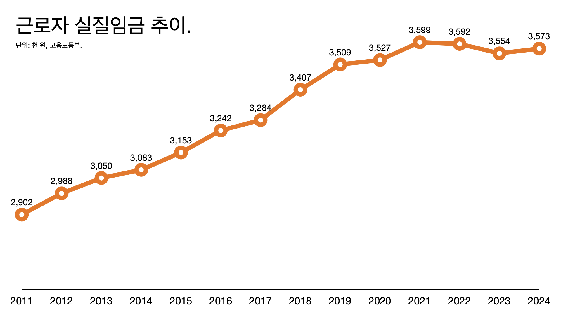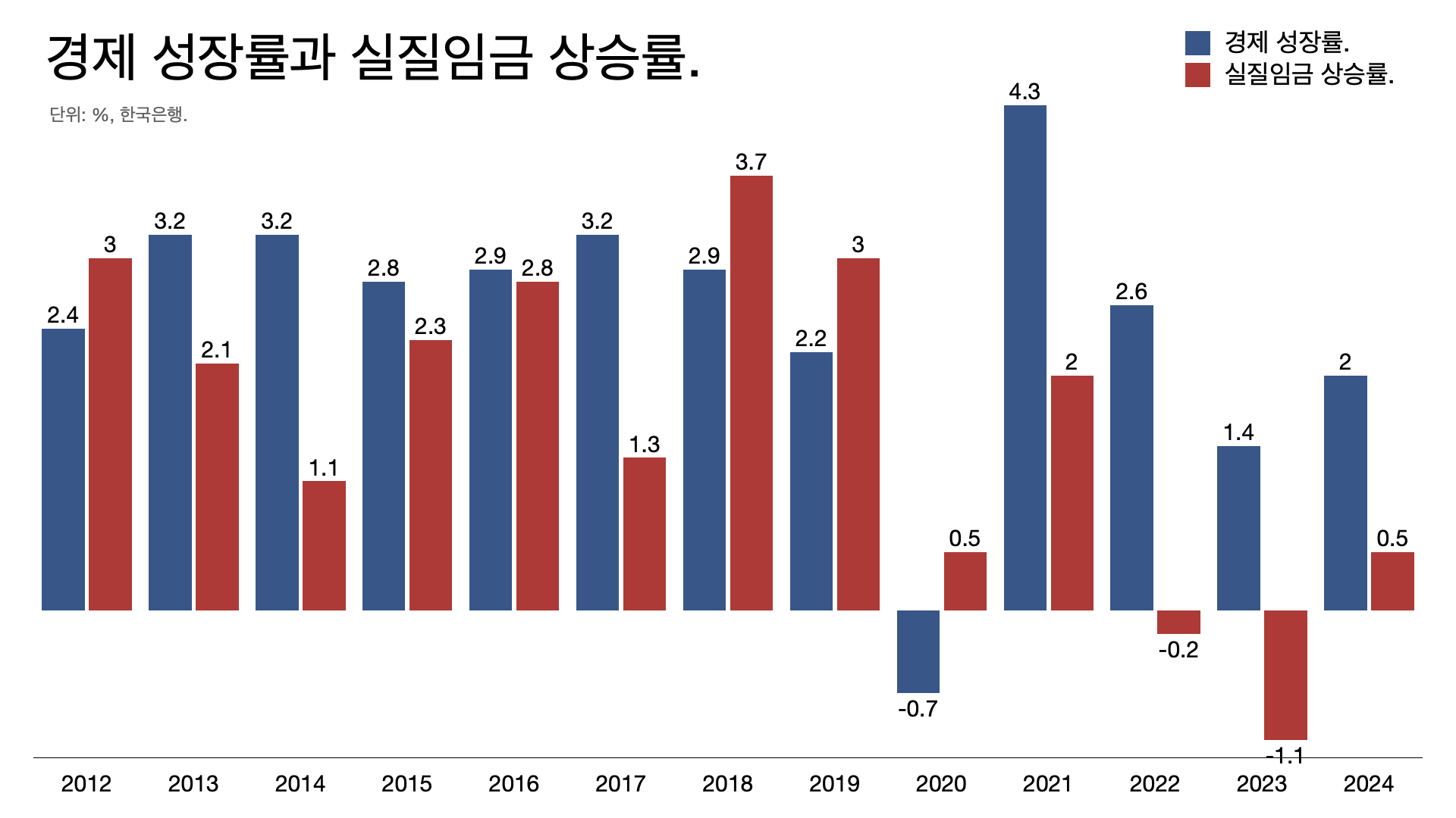 - 실질임금이 꺾인 것도 처음이다. 실질임금 상승률이 경제 성장률을 밑돌았기 때문이다.