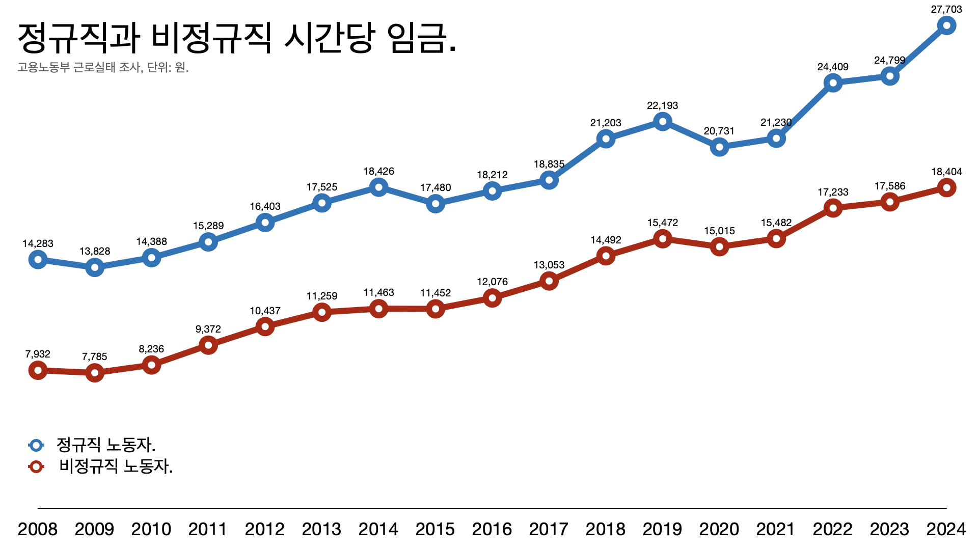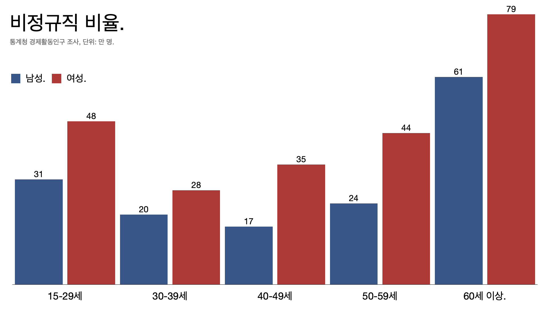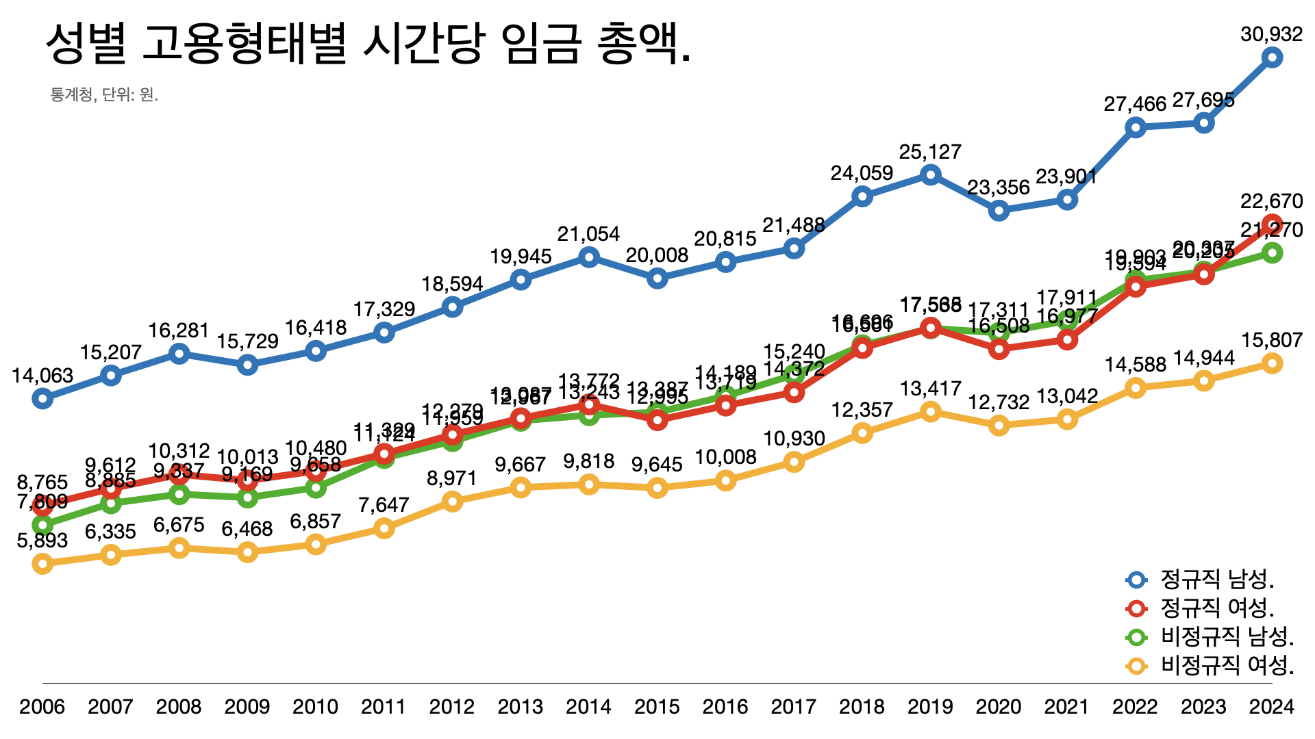 - 정규직 남성의 시간당 임금은 3만932원인데 비정규직 여성은 1만5807원으로 거의 두 배 차이가 난다.