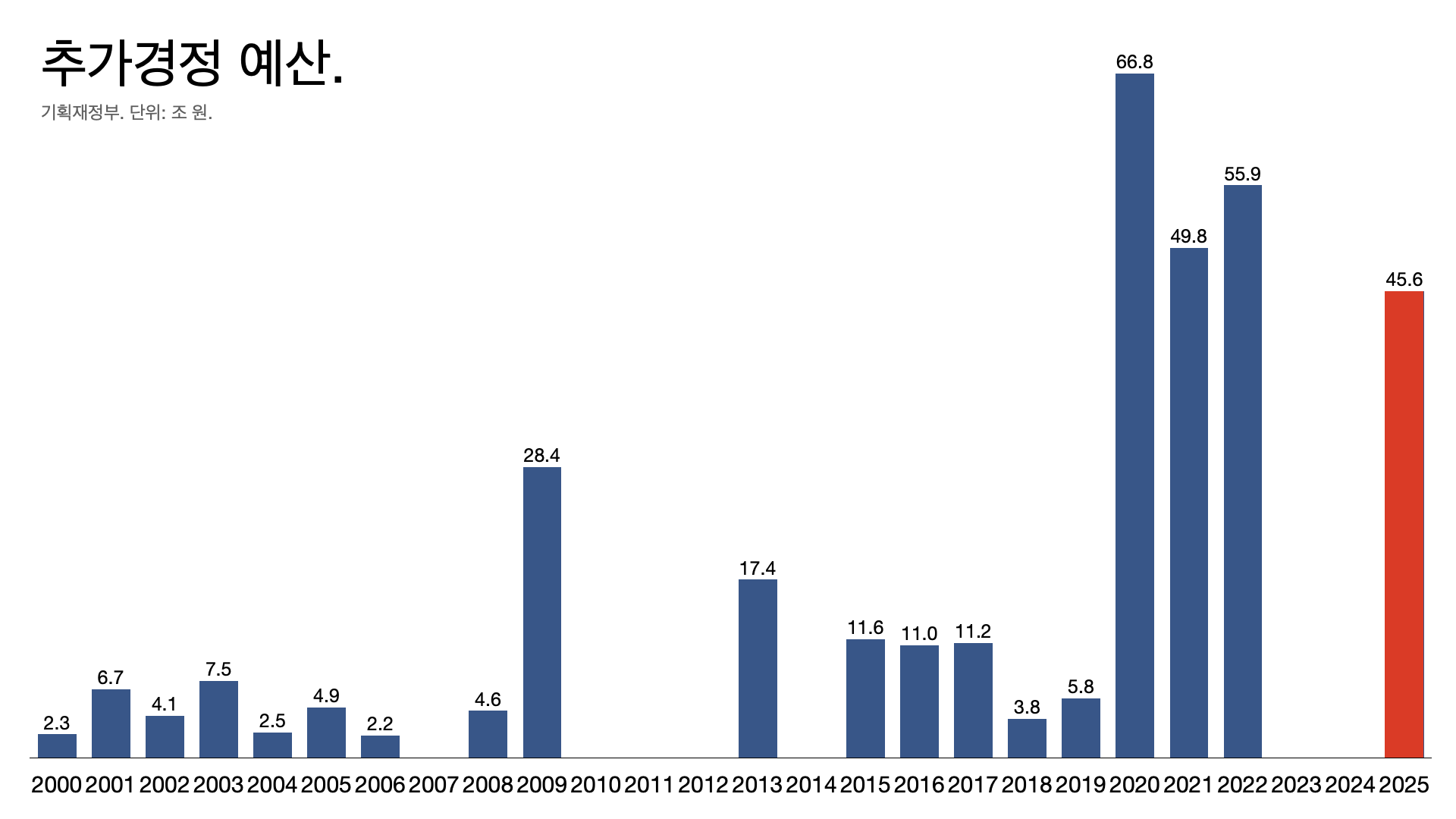 - 2년 동안 없던 추가 경정 예산을 45.6조 원 편성했다. 1차 13.8조 원과 2차 31.8조 원이다.