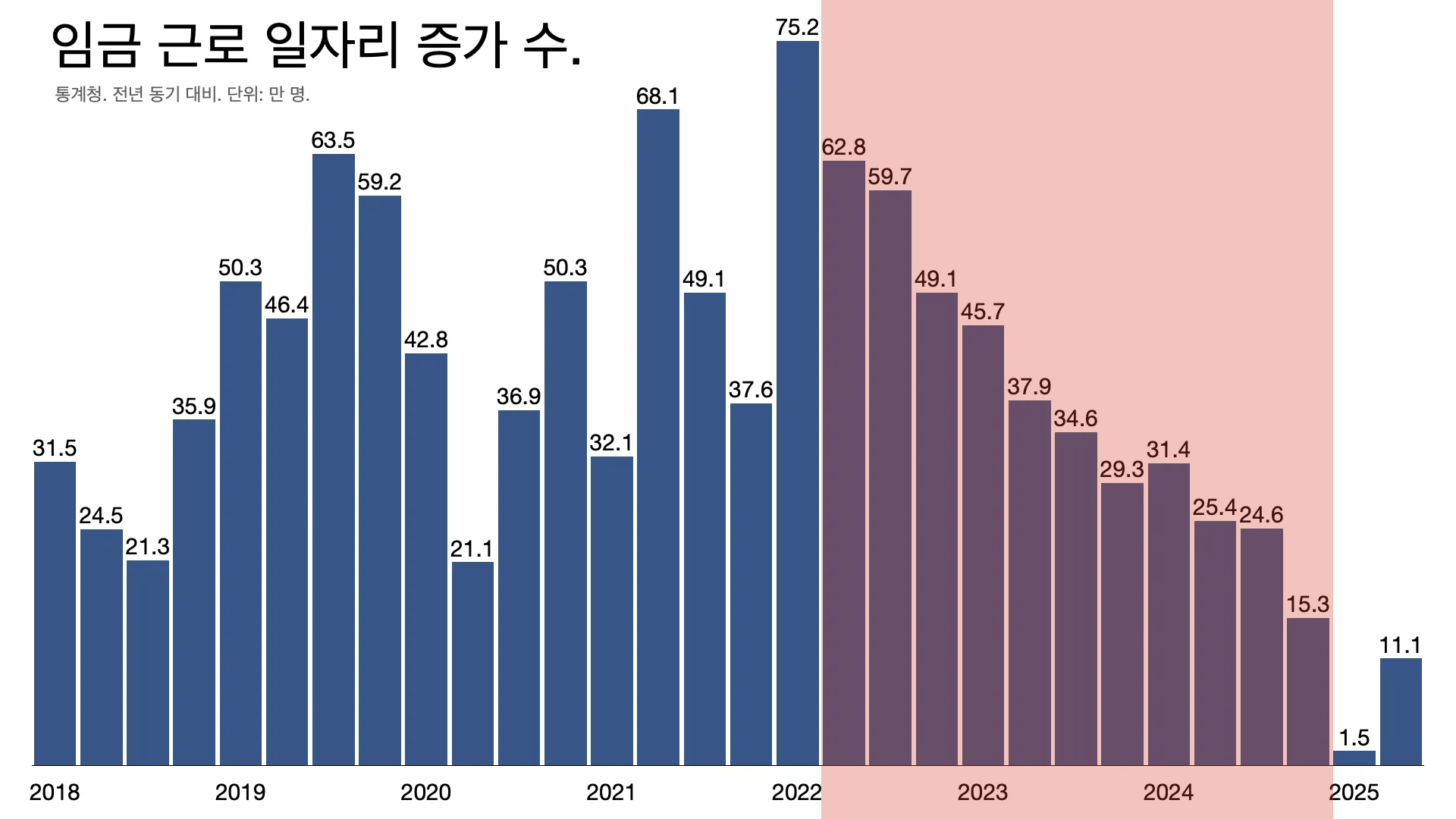 - 일자리 증가 수가 크게 줄었다. 올해 들어 겨우 반등하는 분위기다. 1분기 1.5만 명에 그쳤는데 2분기 11.1명 늘었다.