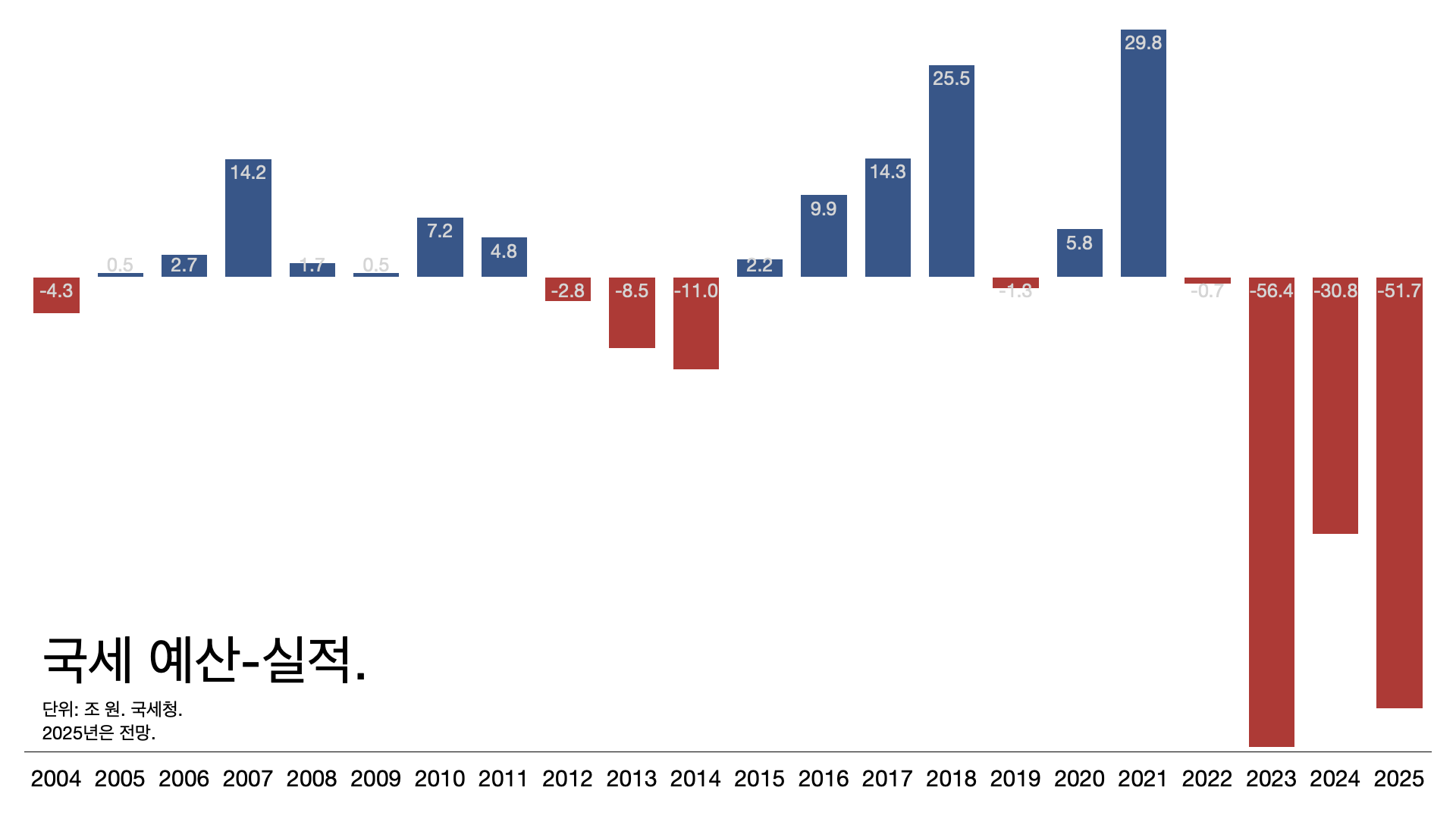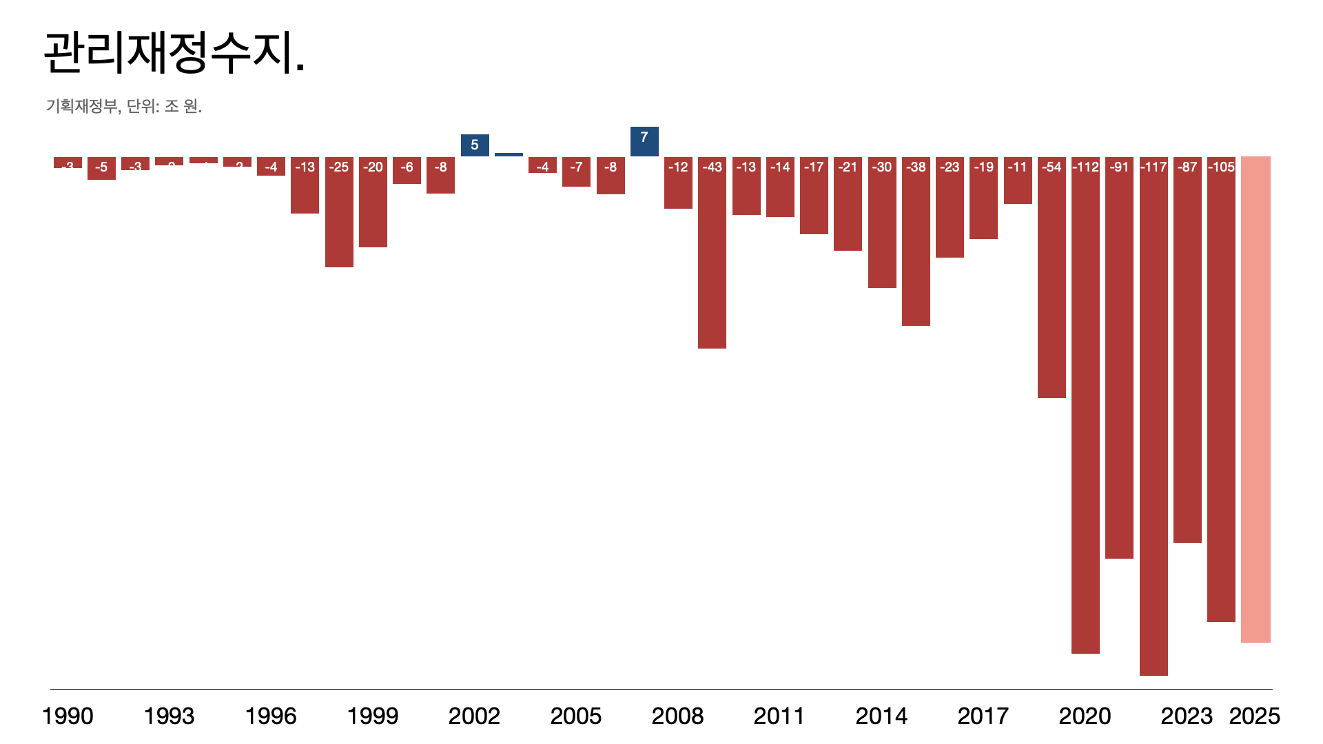 - 결국 2년 동안 세수 결손이 -88조 원. 지난해 관리재정 수지 적자 105조 원을 찍었다.