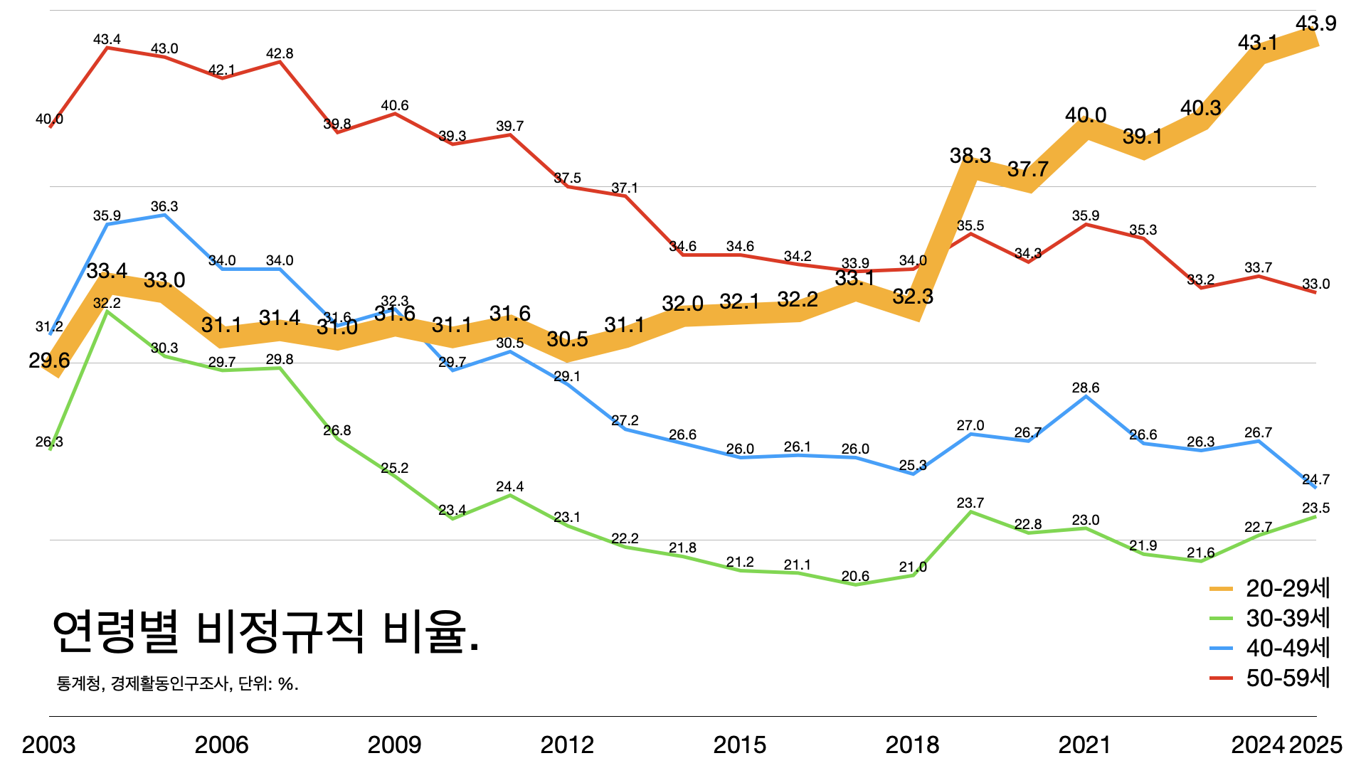 - 20대 비정규직 비율은 44%까지 올랐다.