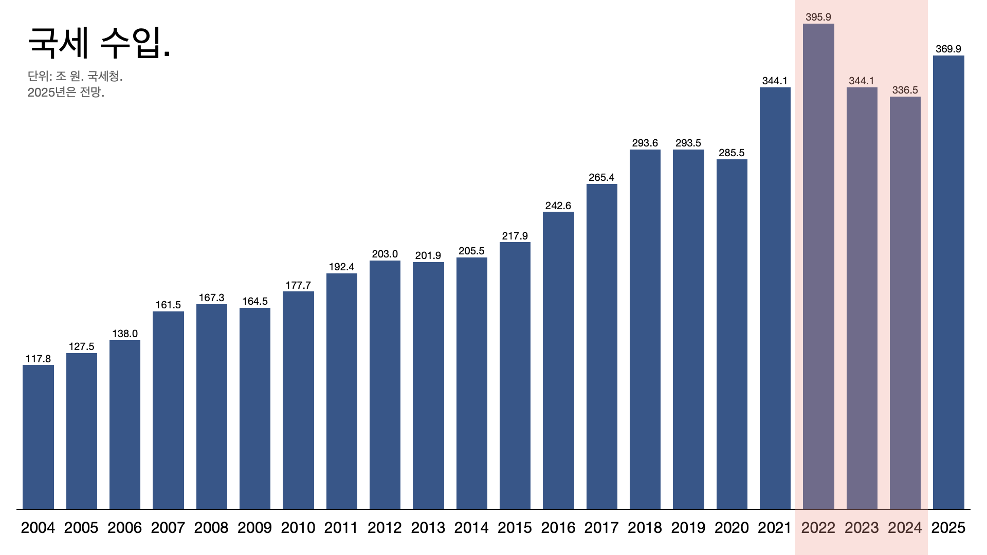 - 2023년 예산안에는 국세 수입이 401조 원이었는데 실제로 걷힌 건 344조 원이었다. 2024년에는 예산을 367조 원으로 줄여 잡았는데 337조 원 밖에 못 걷었다.