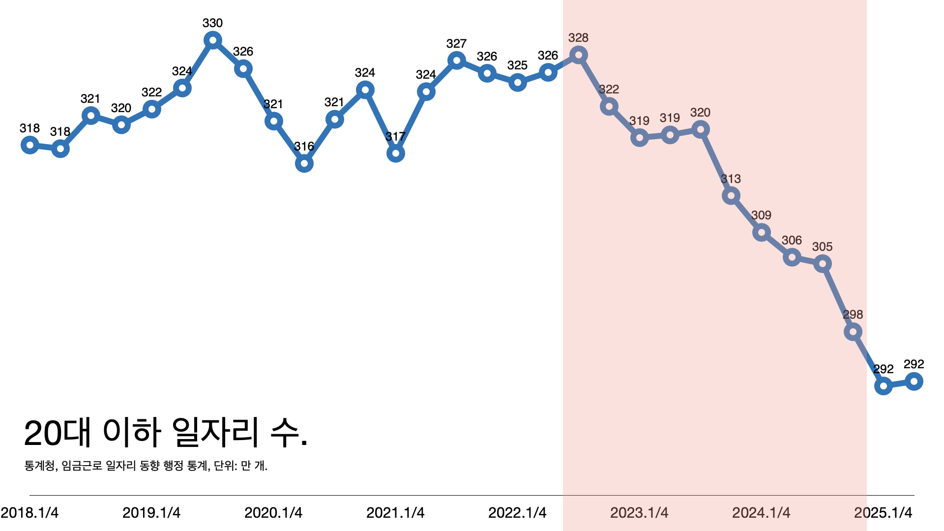 - 20대 이하 일자리가 급격히 줄고 있다. 2022년 328만 개에서 지난해 4분기 292만 개까지 줄었다.