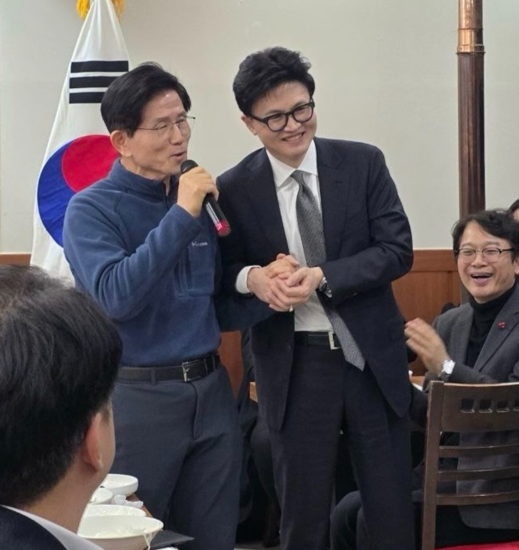 - 이 와중에 한동훈이 김문수(전 노동부 장관)를 만나 러브샷을 한 사진을 올린 건 다분히 의도하는 바가 크다. 김문수는 “우리 당의 보배를 누가 자르려고 하느냐”고 거들었다.