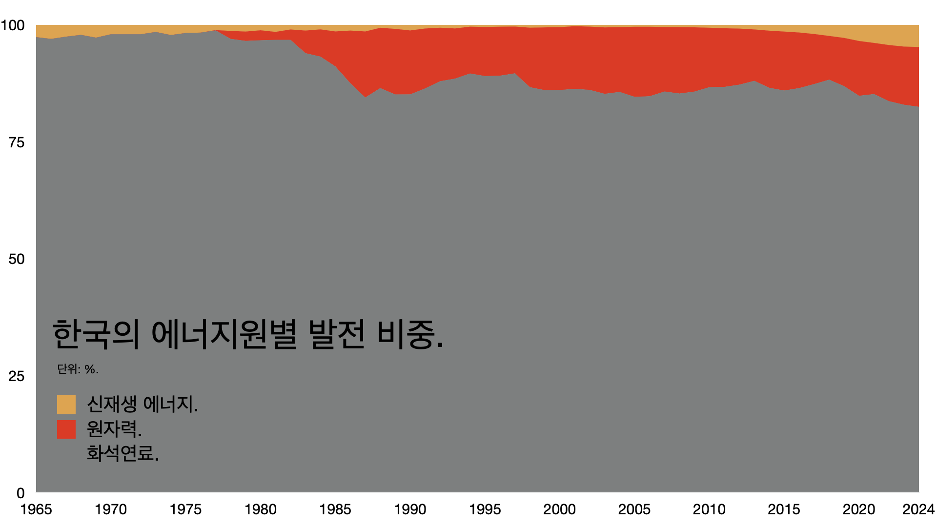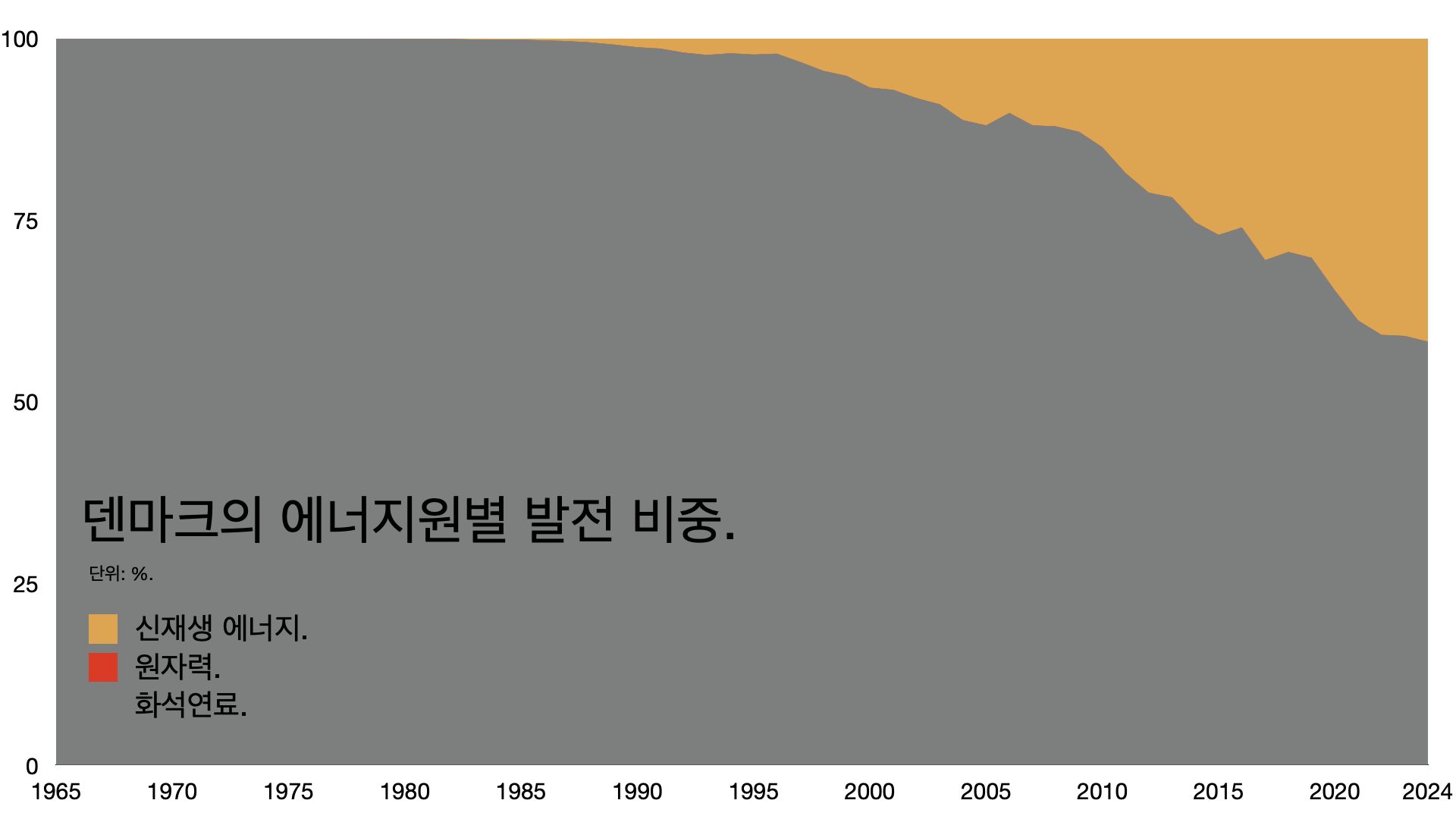 - 한국의 재생 에너지 비중은 5% 정도다. 덴마크는 45%다. 원자력은 쓰지 않고 화석 연료 비중을 계속 줄이고 있다.
