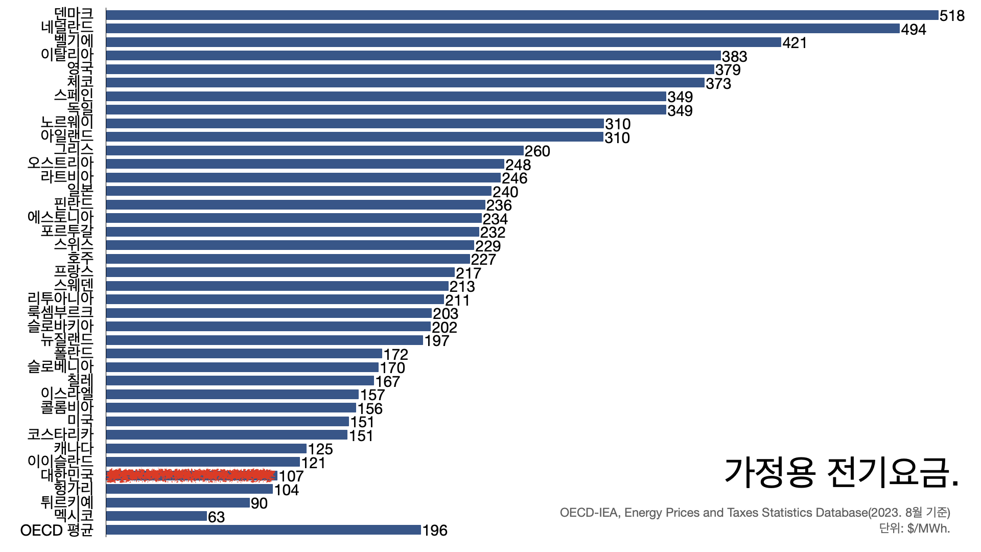 - 한국은 전기 요금이 상대적으로 싼 편이다. 가정용 전기요금이 2023년 8월 기준으로 OECD 평균은 196달러/MWh인데 한국은 107달러/MWh로 절반 수준이다.