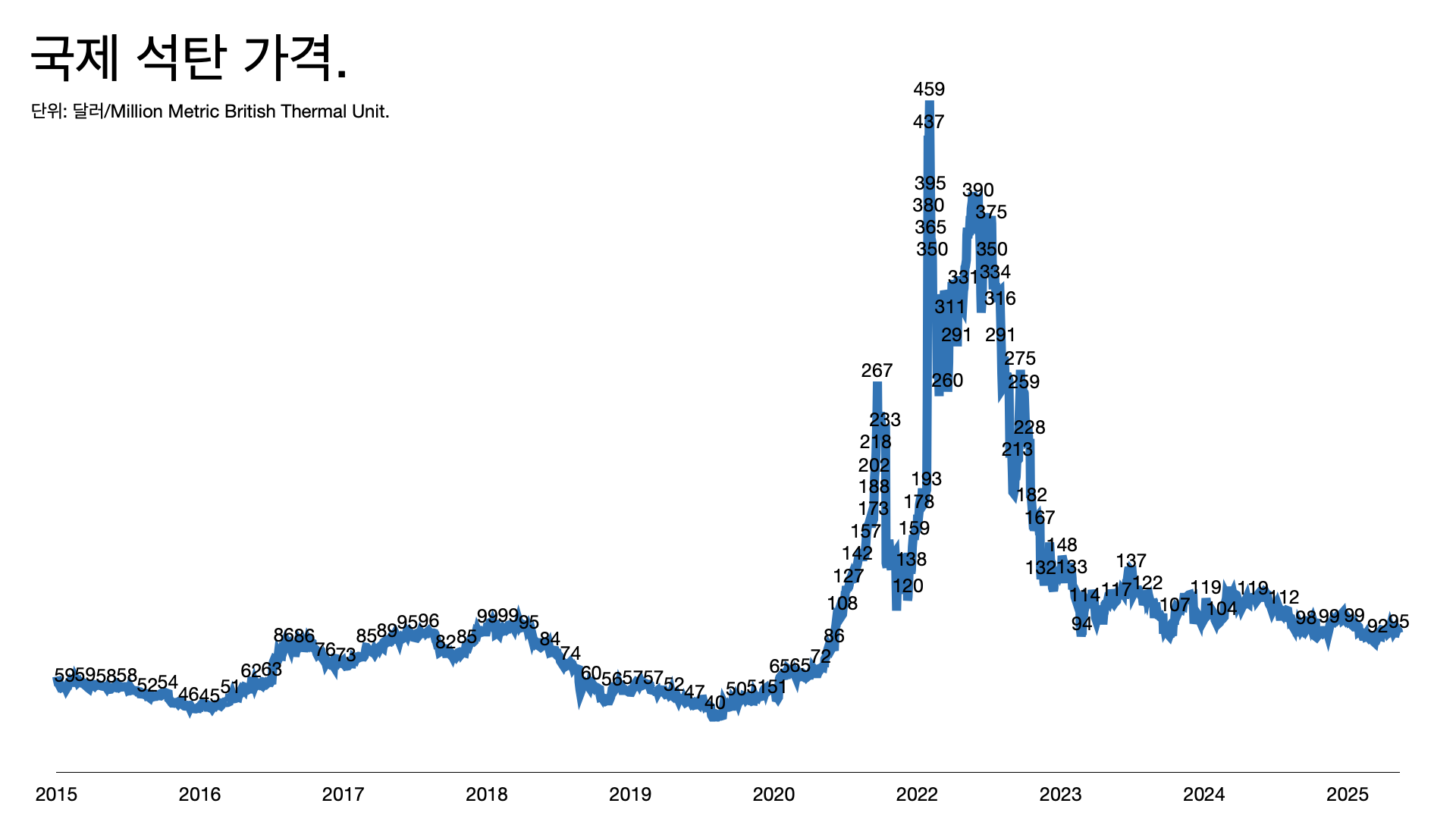 - 석탄 가격도 변동성이 크다. 그때마다 전기요금도 급등락을 거듭했다.