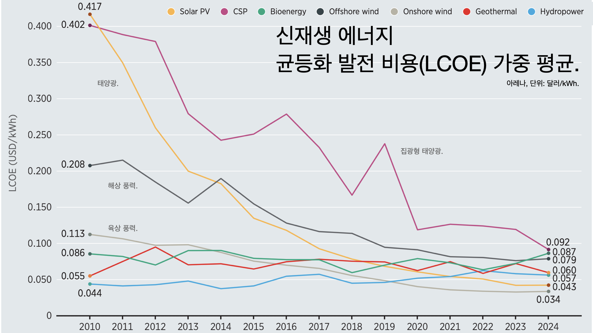 - 아레나 분석에 따르면 2010년과 비교하면 2024년 태양광의 발전 비용(LCOE)는 0.417달러/kWh에서 0.043달러/kWh로 91% 가까이 줄었다. 육상 풍력과 해상 풍력도 각각 70%와 63% 수준으로 줄었다.
