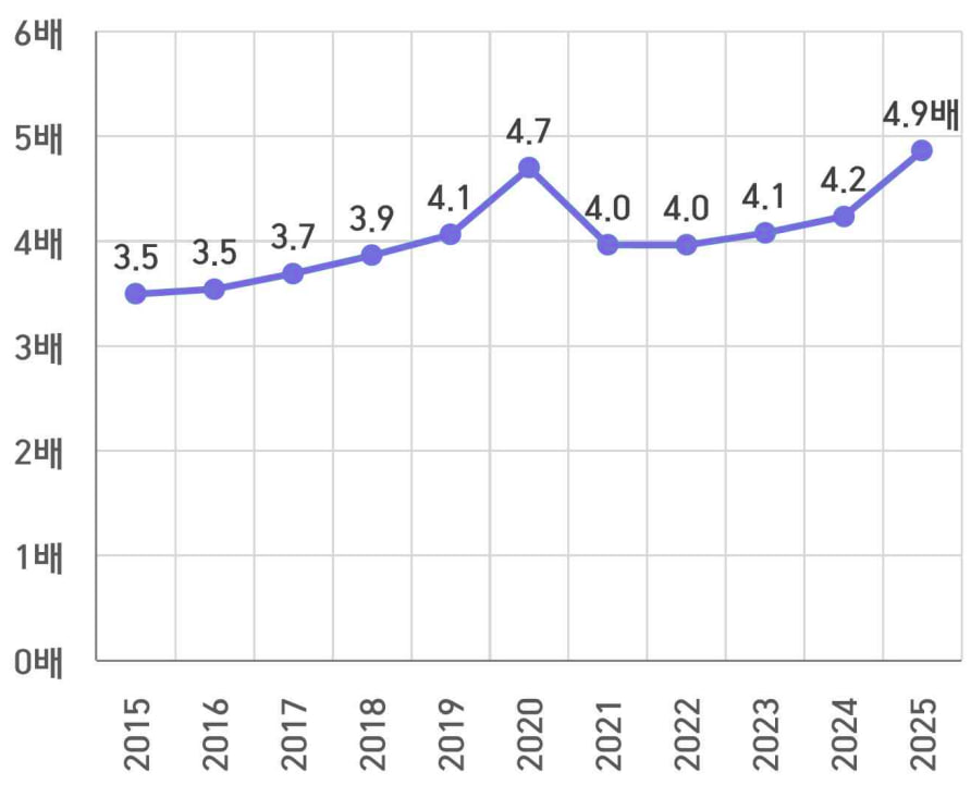 - 진성준 의원실이 의뢰해 토지+자유연구소가 지난 26일 발표한 정책연구보고서를 보면, 2015년부터 2025년까지 지난 10년 동안 서울 아파트 가격은 평균 임금보다 3.2배 상승한 것으로 나타났고, 아파트 평균 가격이 가장 높은 서울 자치구와 가장 낮은 자치구 사이 격차는 2015년 3.5배에서 2025년 4.9배로 확대됐다.(아래 그래프.)