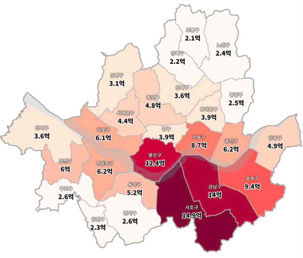 - 서초·강남·용산구는 10년간 평균 아파트 가격 상승액이 10억 원을 초과. 상승액이 가장 큰 서초구는 평균 가격이 14.9억 원 상승. 서초구 아파트 보유자는 연평균 1.5억 원의 자본이득 발생.
