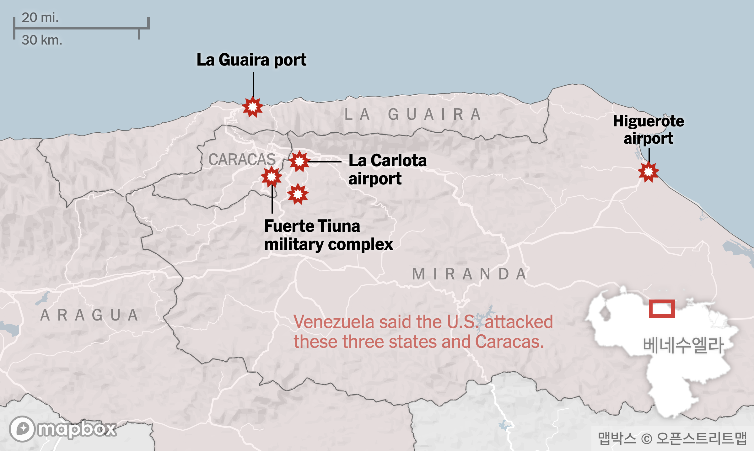 미국이 베네수엘라 수도 카라카스를 공습해서 니콜라스 마두로(베네수엘라 대통령)를 납치했다. 뉴욕타임스 등에 따르면 카라카스에서 최소 7차례 폭발음이 울렸다. 미국 동부시간으로 3일 새벽 2시30분, 베네수엘라 시간 새벽 1시30분이었다.