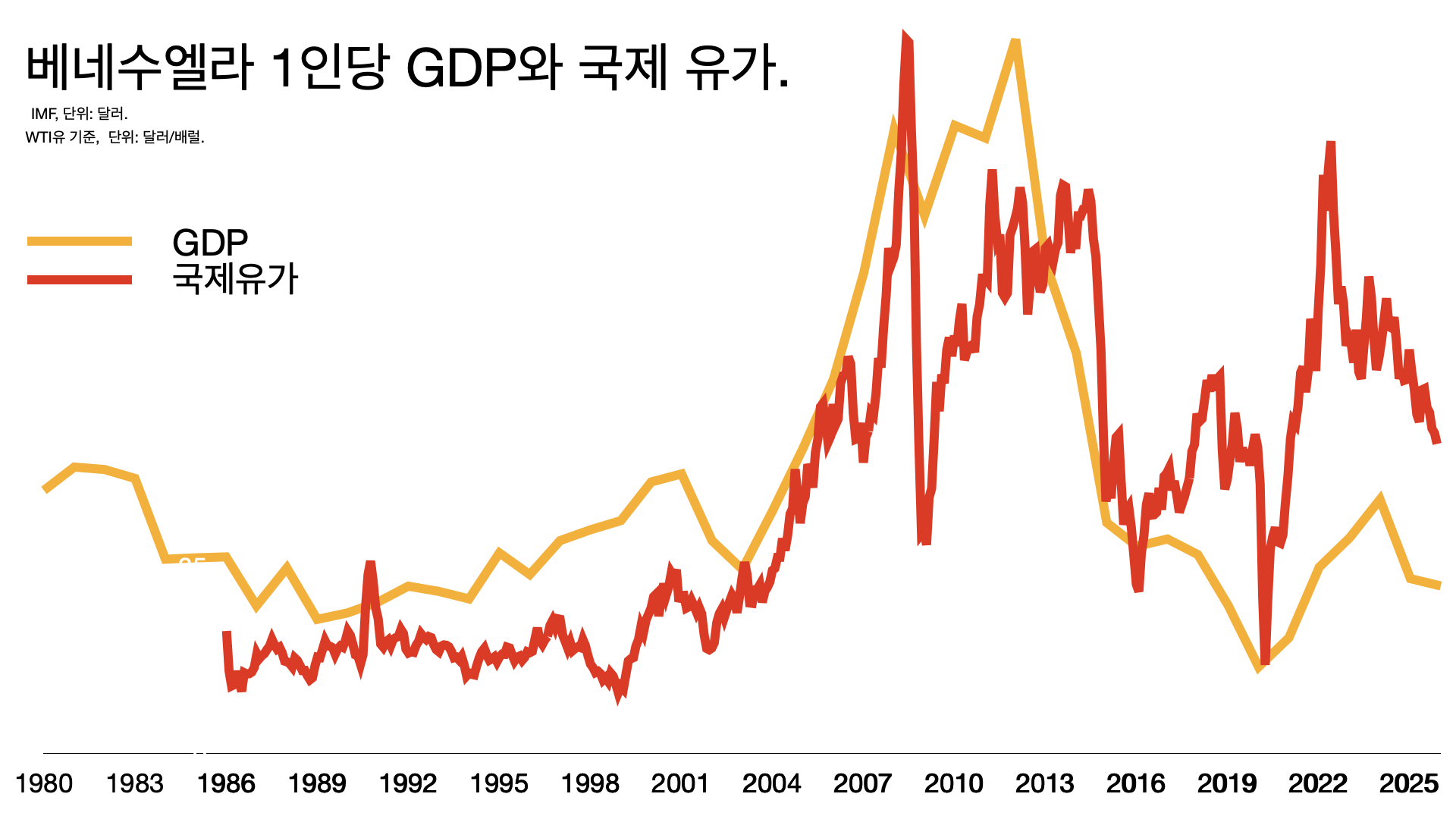 - 베네수엘라는 2014년 1배럴에 100달러 이상이던 국제 유가가 2016년 30달러 밑으로 떨어지면서 심각한 경제 위기에 직면했다. 그런데 정작 유가가 오른 뒤에도 상황은 개선되지 않았다.