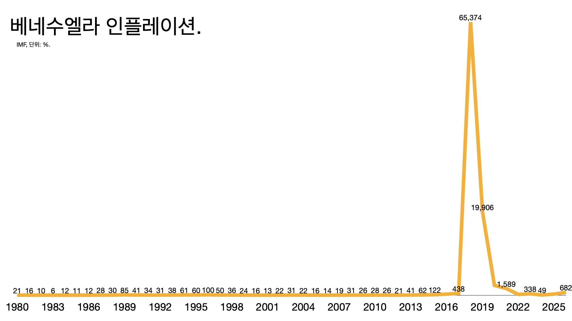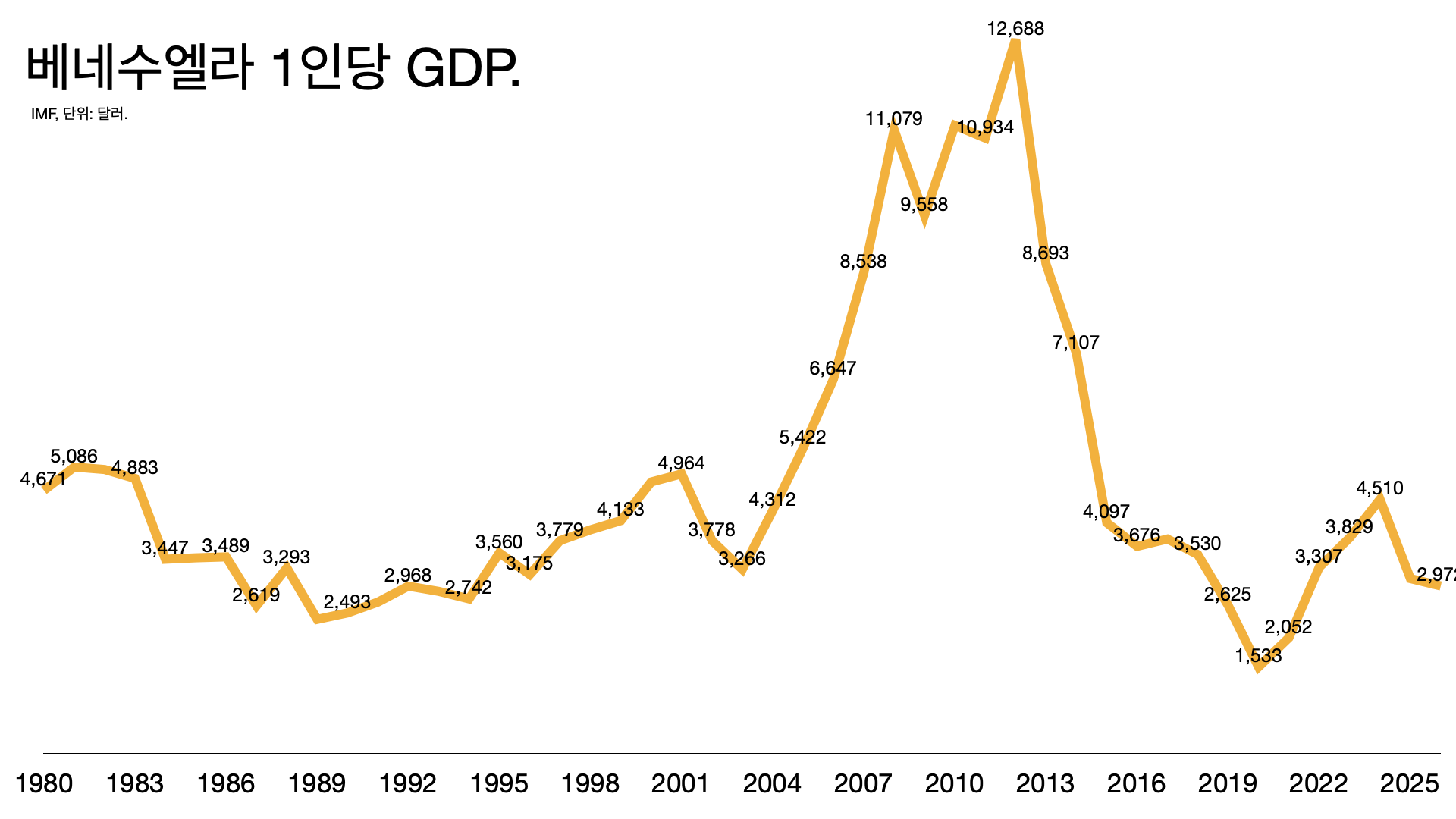 - 한때 베네수엘라는 남미에서 1인당 국민소득이 가장 높은 나라였다. 부정부패가 늘었고 1998년 우고 차베스(당시 베네수엘라 대통령) 취임 이후 경제는 더욱 엉망이 됐다.