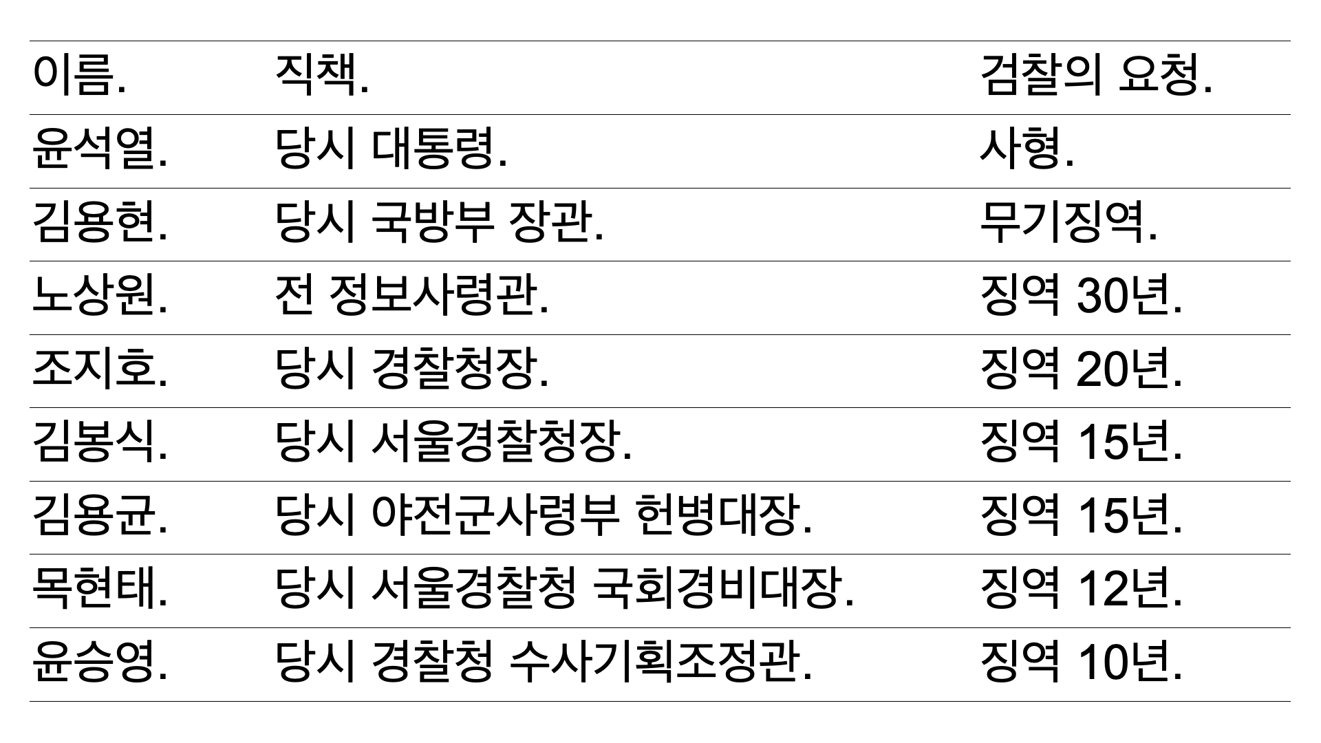 - 조지호(전 경찰청장)와 김봉식(전 서울경찰청장)에게는 각각 징역 20년과 징역 15년을 선고해 달라고 요청했다.