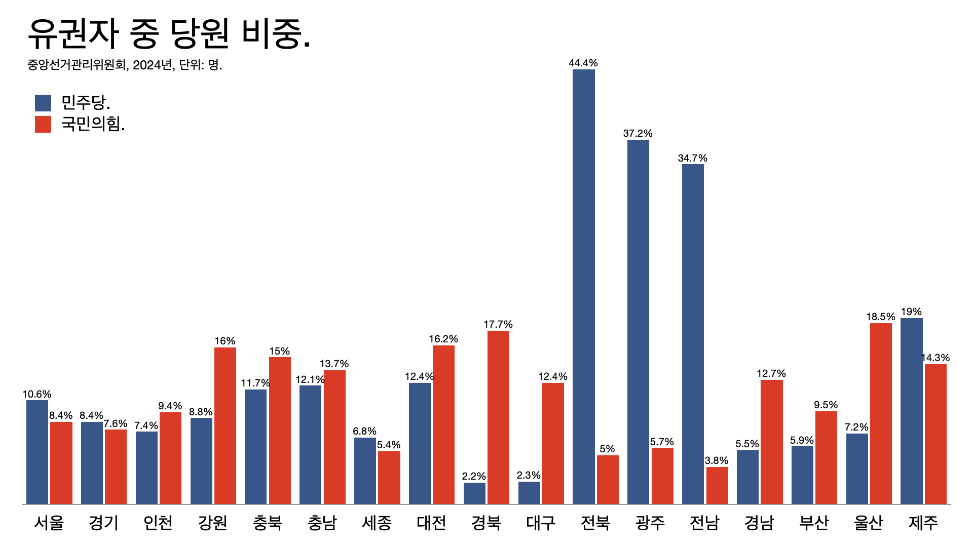 - 민주당은 광주와 전남, 전북에서 당원 비중이 높고 강성 지지층이 몰려 있다. 1인1표제로 가면 친청 체제가 더욱 강화될 거라는 관측이 나온다.
