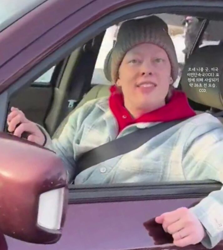 사살 직전 모습은 그 비현실성을 극대화한다. 아래 사진은 6살배기의 엄마 르네 굿이 죽임을 당하기 26초 전 모습이다. 이 사진에서 우리는 어떤 죽음의 그림자도 발견하기 어렵다. 하지만 저 평범한 모습이 찍힌 26초 뒤 이 평범한 미국 미니애폴리스 시민은 ‘아이스’(ICE; United States Immigration and Customs Enforcement)라는 약칭으로 불리는 미국 이민세관단속국 요원에 의해 사살당한다. 이 살인자는 자동차 앞창문을 통해 르네를 정면에서 사살하고, 멈춰진 자동차 옆창문을 통해 두 번 더 확인 사살한다. 2026년 1월 7일의 일이다. 개인적 일탈이 아니다. 공인된 살인 기계다. 국가 폭력 시스템의 한 부품이 되어 버렸다.