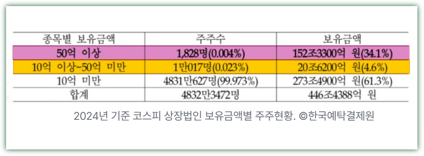 2025년 세제개편에서 정부는 주식 양도세 대주주 기준을 기존 10억 원으로 환원하겠다고 밝혔지만, 결국 윤석열 정부 당시 상향된 50억 원 기준을 유지했다. 정부 의지만으로도 시행령을 되돌릴 수 있었지만, 여론을 의식해 포기한 것이다. 그 결과 현재 양도차익 과세 대상은 전체 투자자의 0.004%에 불과한 초고액 자산가에만 해당된다.