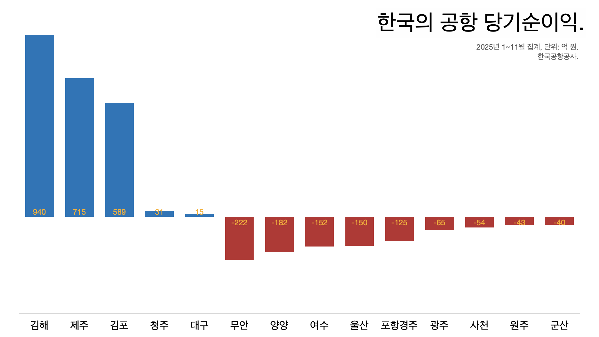 - 김해공항과 제주공항, 김포공항은 각각 940억 원과 715억 원, 589억 원의 당기 순이익을 냈다.