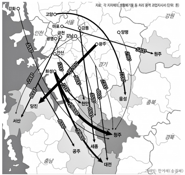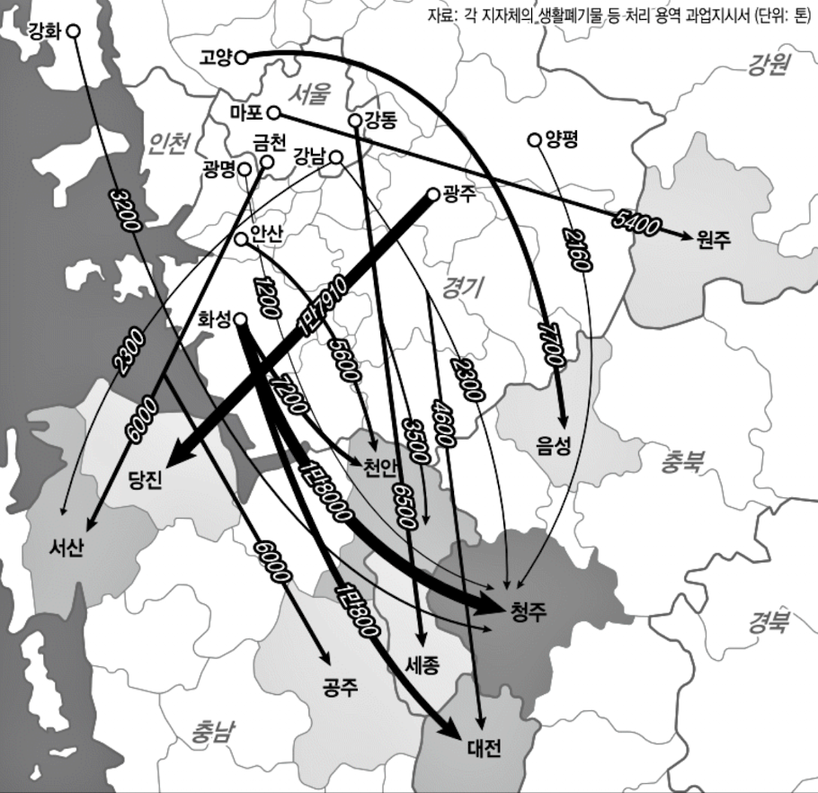 - 경기도 화성은 서울에서 5만6040톤의 쓰레기를 받고 화성의 쓰레기 3만6000톤을 충북 청주와 대전, 충남 천안으로 다시 내려보낸다.