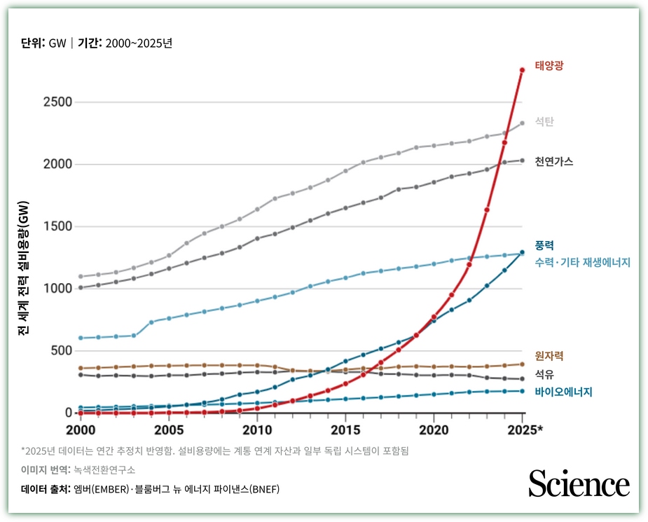 다른 하나는 2025년 태양광 발전 설비용량이 석탄화력발전량을 최초로 추월했다는 것이다. 재생에너지가 화석연료보다 더 많은 전기를 생산했다는 것. 이는 인류가 에너지 전환의 결정적 문턱을 통과하고 있다는 뜻이다. 과학잡지 사이언스가 이를 ‘2025년 최대의 성과’로 뽑았다는 사실은, 이러한 전환이 구조적 변화임을 암시한다.