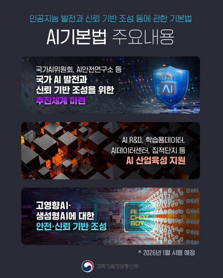 - 오늘부터 AI 기본법이 시행된다. AI로 만든 이미지와 영상, 음성을 유통할 경우 AI 생성물이라는 사실을 표시해야 한다. AI 사업자가 대상이고 일반인과 언론사 등은 해당하지 않는다.