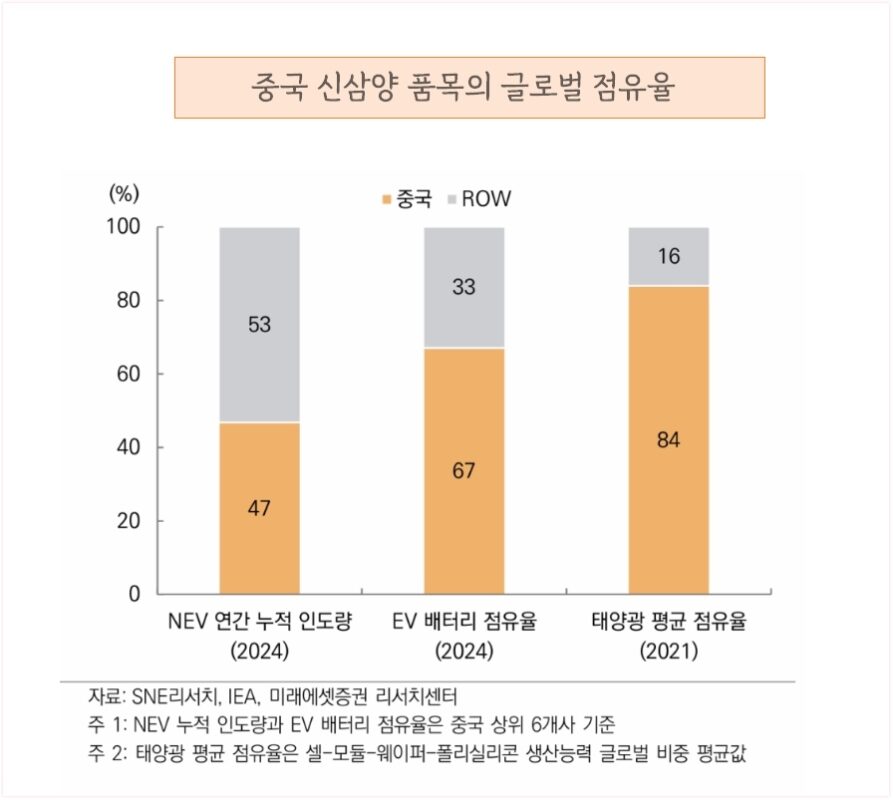 중국 ‘뉴트리오’는 이미 2021~2024년 사이에 세계 시장 점유율 50~80%를 기록한 바 있다. 미래에셋증권의 ‘중국의 쌍탄 전략 : 순항 중인 에너지 전환, 그린 디커플링 현실화’ 보고서는 세계 시장에서 중국 기업들이 태양광은 84%(2021년), 전기차 배터리는 67%(2024년), 전기차는 47%(2024년)를 차지했다고 분석했다.