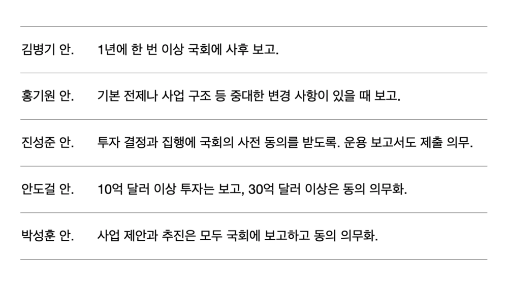 - 투자 대상은 미국 정부가 결정하고 한국 정부는 협의만 할 수 있을 뿐이지만 박성훈(국민의힘 의원) 안은 사업 제안과 추진을 모두 국회에 보고하고 동의를 받아야 한다는 내용이다. 민주당으로서는 받을 수 없는 안이다. 진성준(민주당 의원) 안도 국회의 사전 동의를 받도록 하고 있다. 안도걸(민주당 의원) 안은 10억 달러 이상은 보고, 30억 달러 이상은 동의를 의무화하는 내용이다. 김병기(무소속 의원) 안은 사후 보고만 하면 된다.