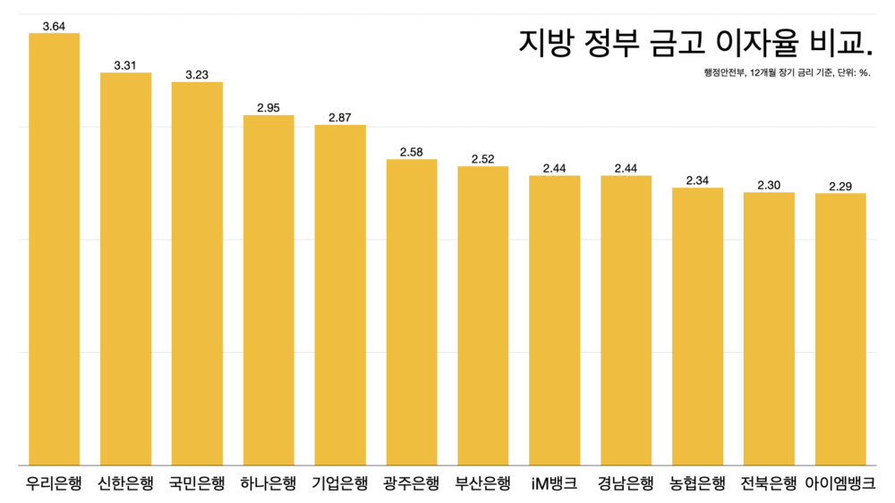 - 17개 광역 지방 정부의 금리 평균은 2.61%다. 인천이 4.57%로 가장 높고 경상북도가 2.15%로 가장 낮다. 각각 신한은행과 농협은행이 금고다.
