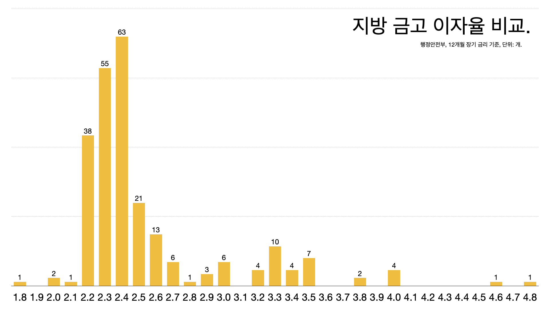 - 17개 광역 지방 정부의 금리 평균은 2.61%다. (올해 1월 기준 시중은행 정기예금 금리가 연 2.8% ~ 3.1% 정도인데 평균보다 훨씬 낮다.)