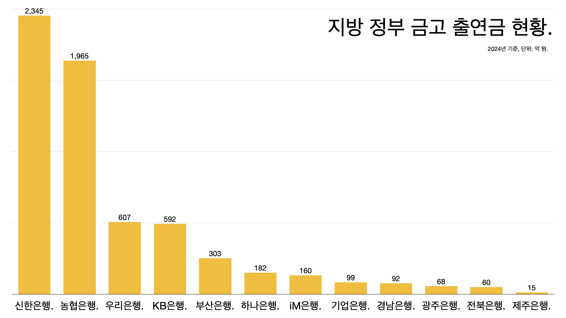 - 신한은행이 2345억 원(36.2%)으로 가장 많고, 농협은행 1965억 원, 우리은행 607억 원, KB은행 592억 원, 부산은행 303억원 순이다.