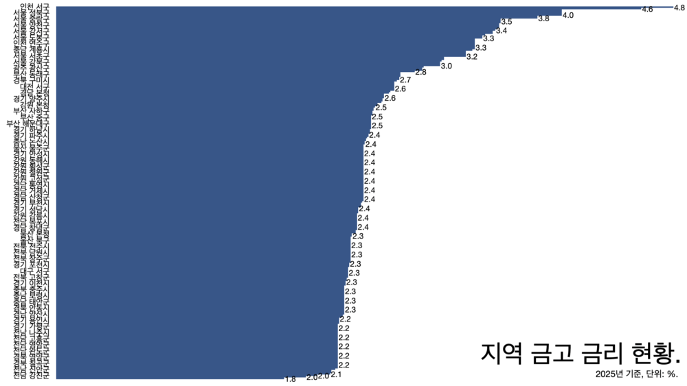 - 17개 광역 지방 정부의 금리 평균은 2.61%고 226개 기초 지방 정부는 2.52%다. 인천 서구가 4.82%로 가장 높고 경기 연천군이 1.78%로 가장 낮다. 시중은행의 정기예금 금리 2.8~3.1%와 비교하면 턱없이 낮은 금리다.