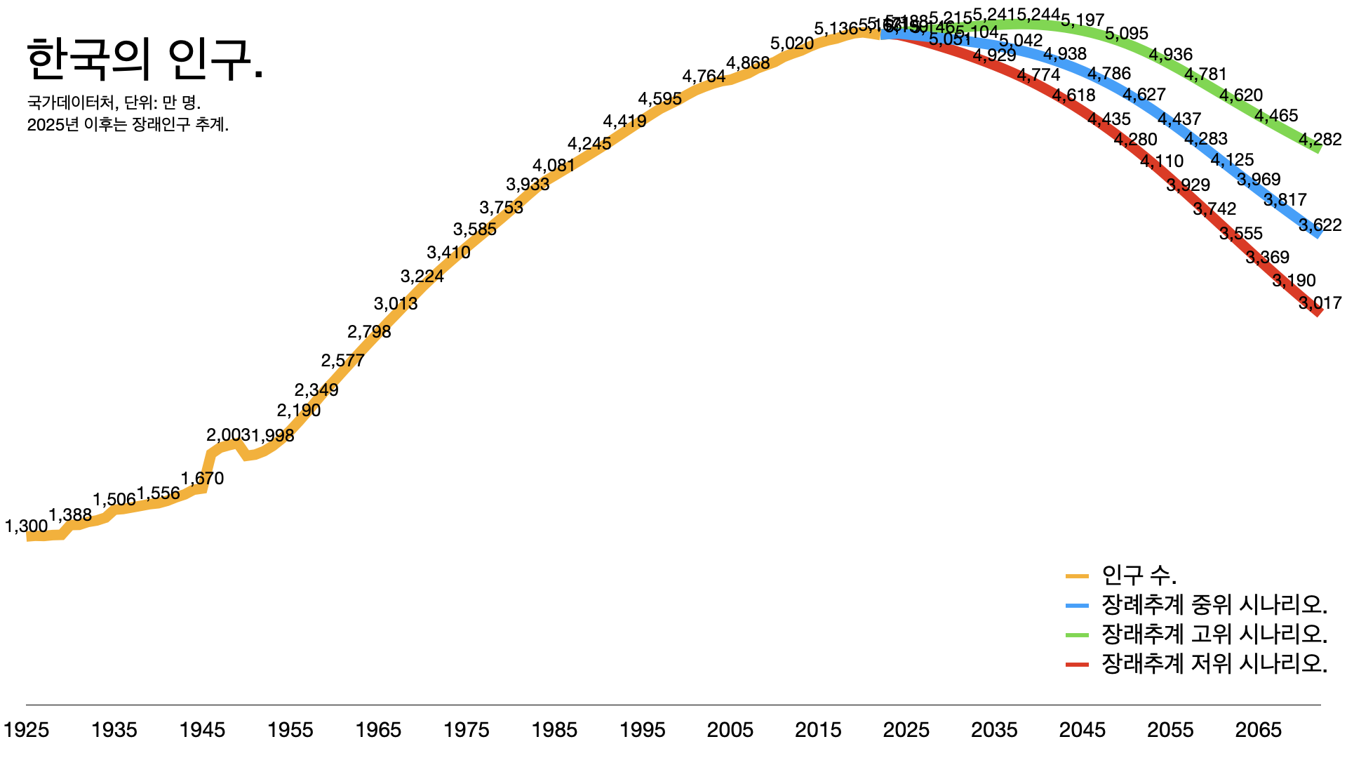 - 첫째, 인구 감소의 속도를 줄여야 한다. 통계청 장래 인구 추계를 보면 2072년 3017만 명 시나리오와 4282만 명 시나리오가 공존한다. 어떤 미래를 선택할 것인가.