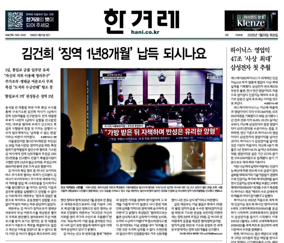 - 한겨레 1면 머리기사 제목은 “납득 되시나요”다.