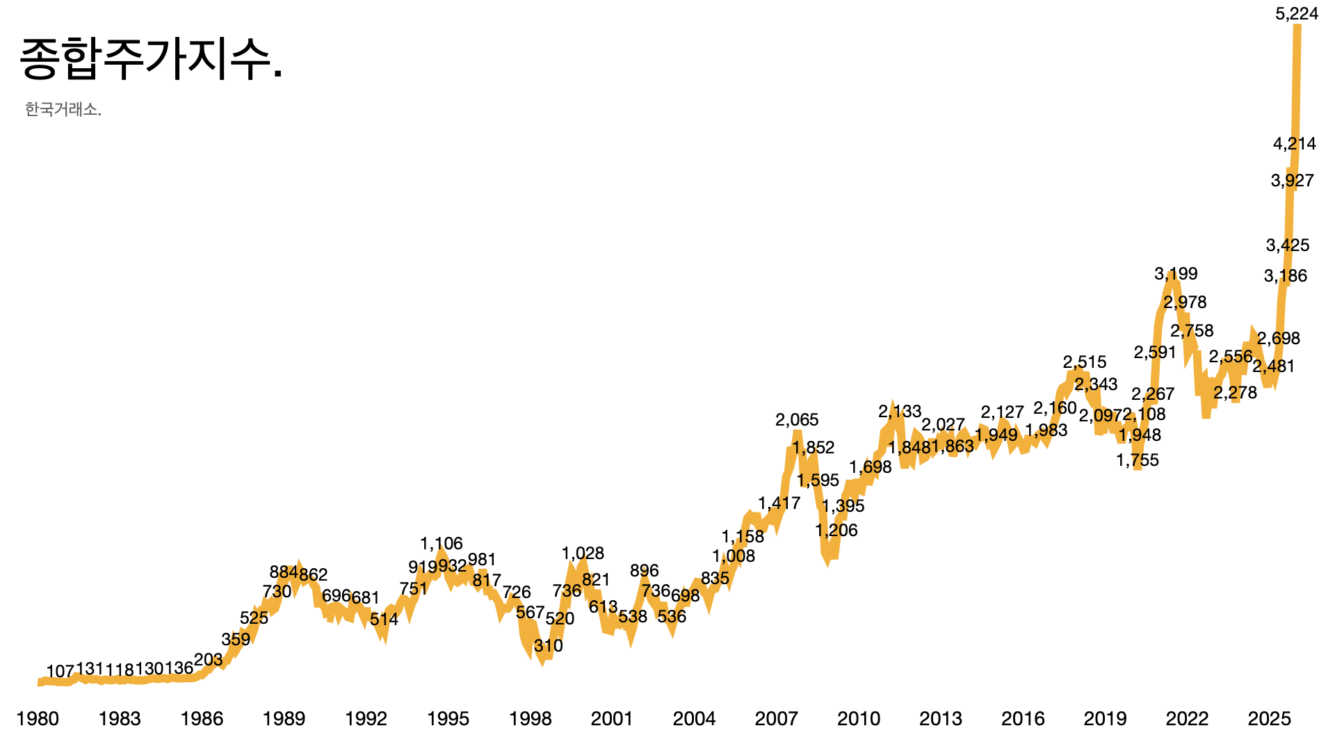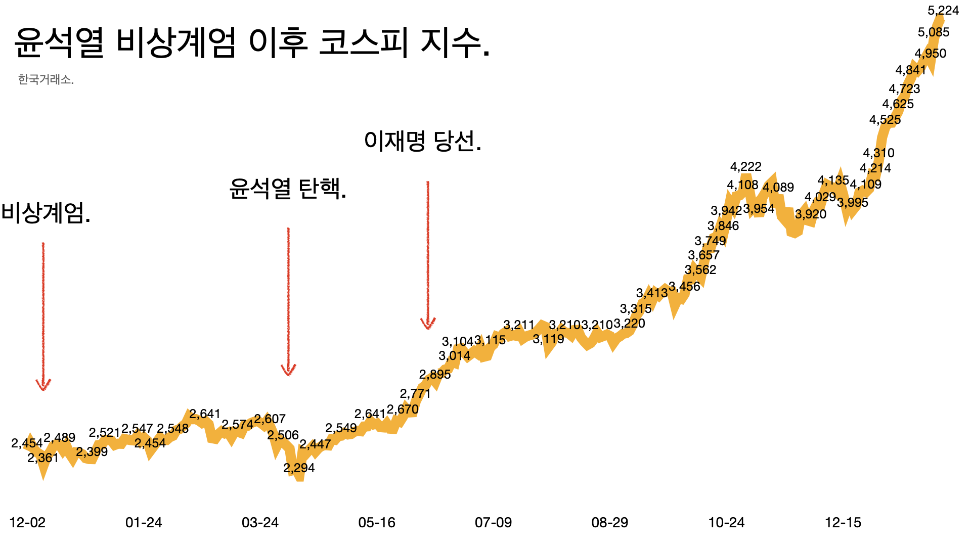 코스피가 1월 22일 사상 처음 5000선을 돌파한 이래 연일 최고치를 경신하고 있다. 대통령 이재명은 취임 8개월 만에 대선공약 ‘코스피 5000’을 조기 달성했다. 이재명은 “대한민국 기업들이 제대로 평가받으면 국민 모두의 재산이 늘어나는 것”이라고 말했다.