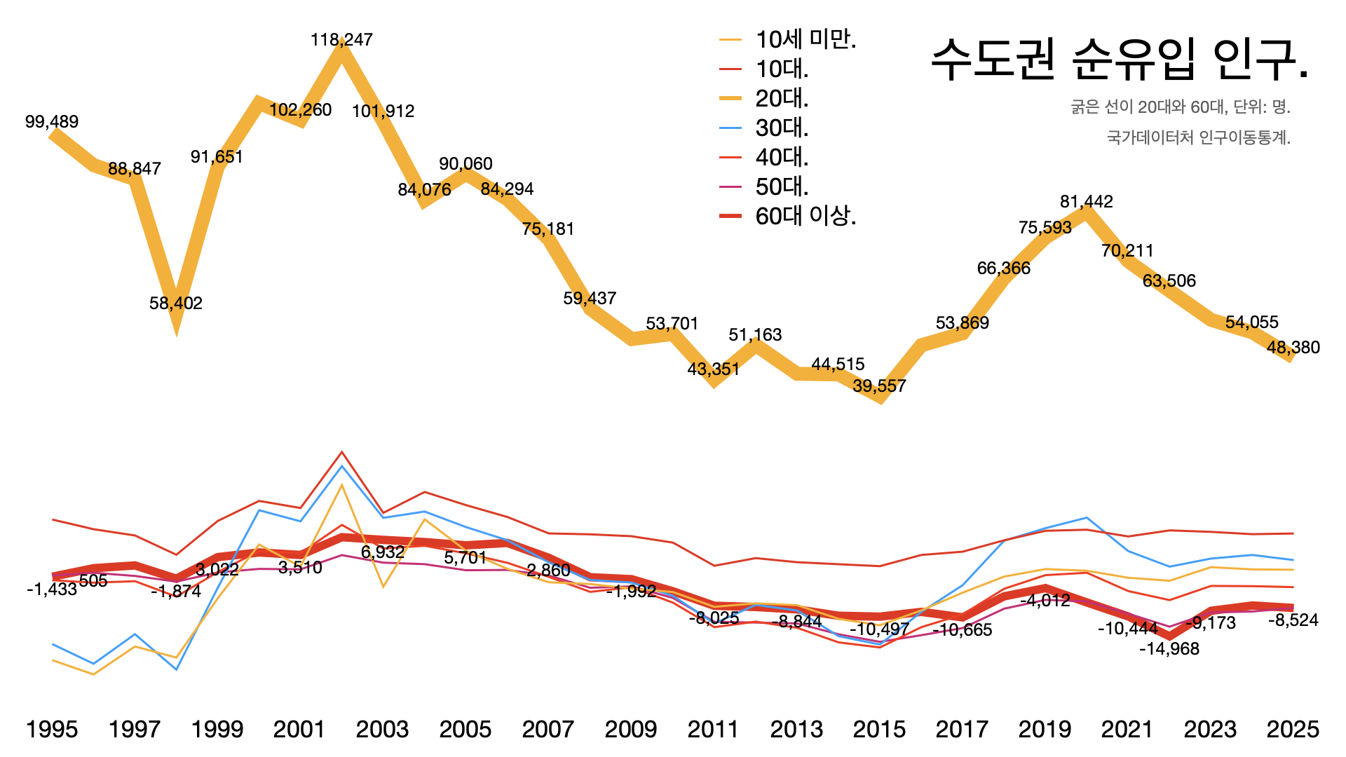 - 612만 명이 주소를 옮겼는데 30대 이상은 5.8만 명이 수도권으로 순유입, 40대 이상은 2.2만 명이 순유출됐다.
