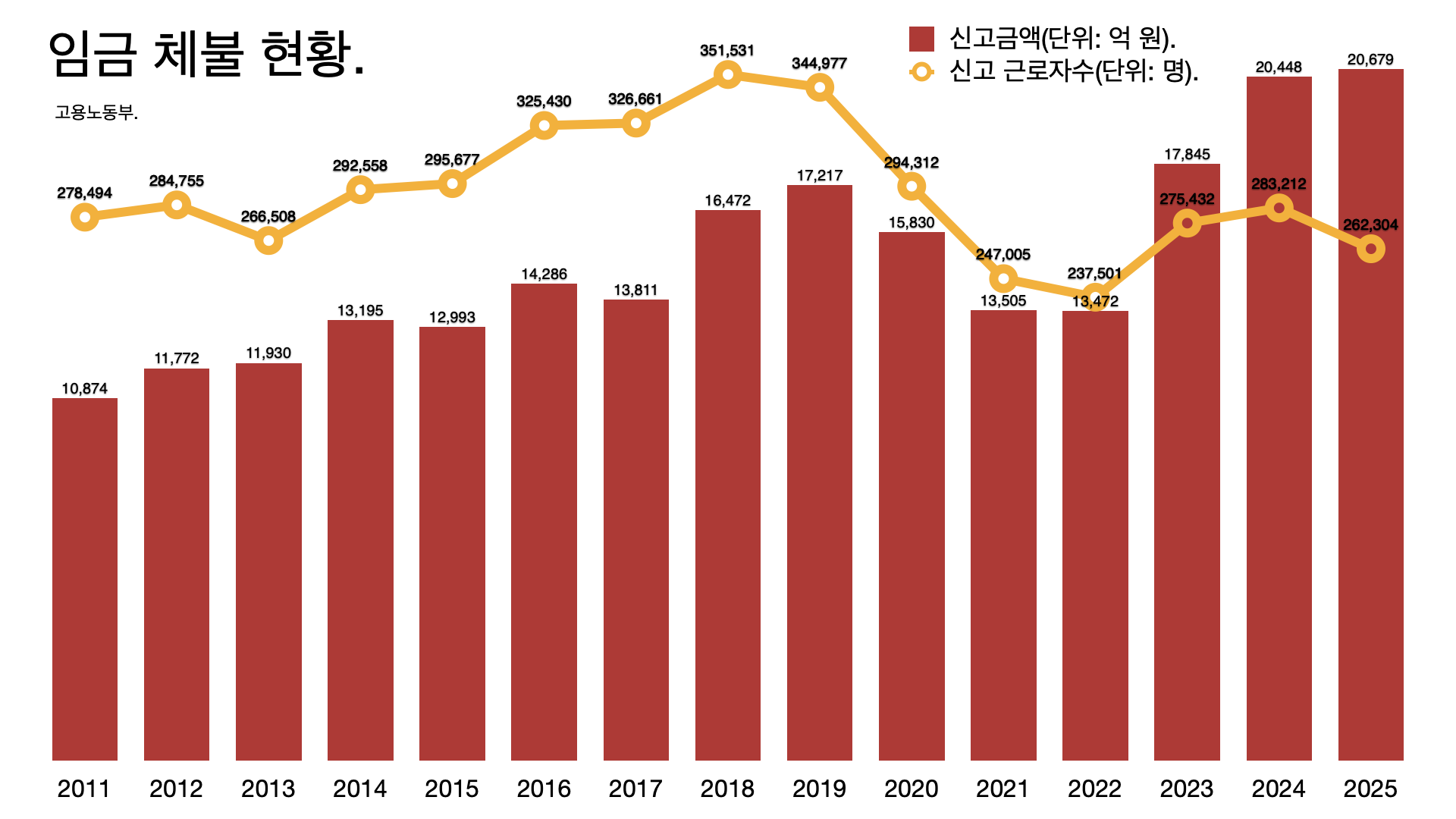 - 임금 체불 총액은 2조679원으로 1% 가까이 늘었다. 중대형 사업장 체불이 늘었기 때문이다.