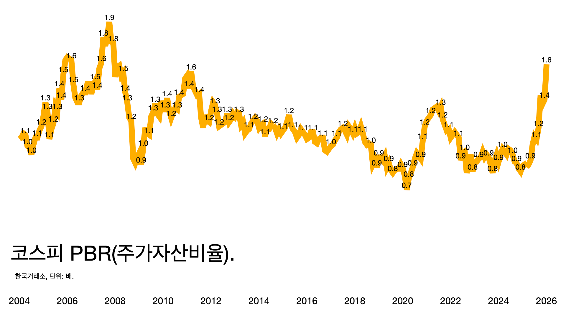 - 한국 코스피의 PBR(주가자산비율)은 올해 들어 겨우 1.6을 넘어선 상태다. 이머징 마켓 평균은 2.3 정도, 선진국은 4.0이 넘는다.
