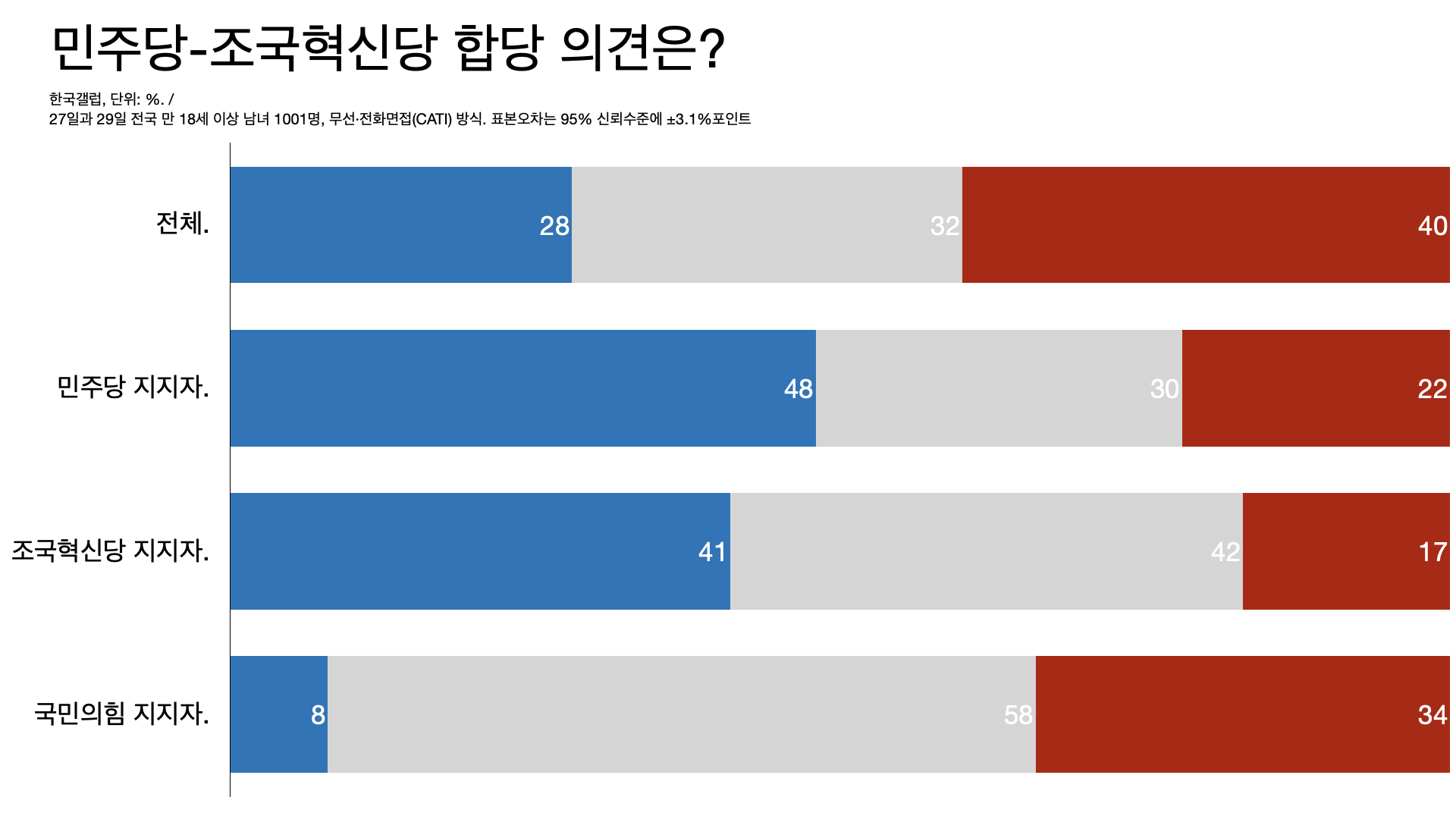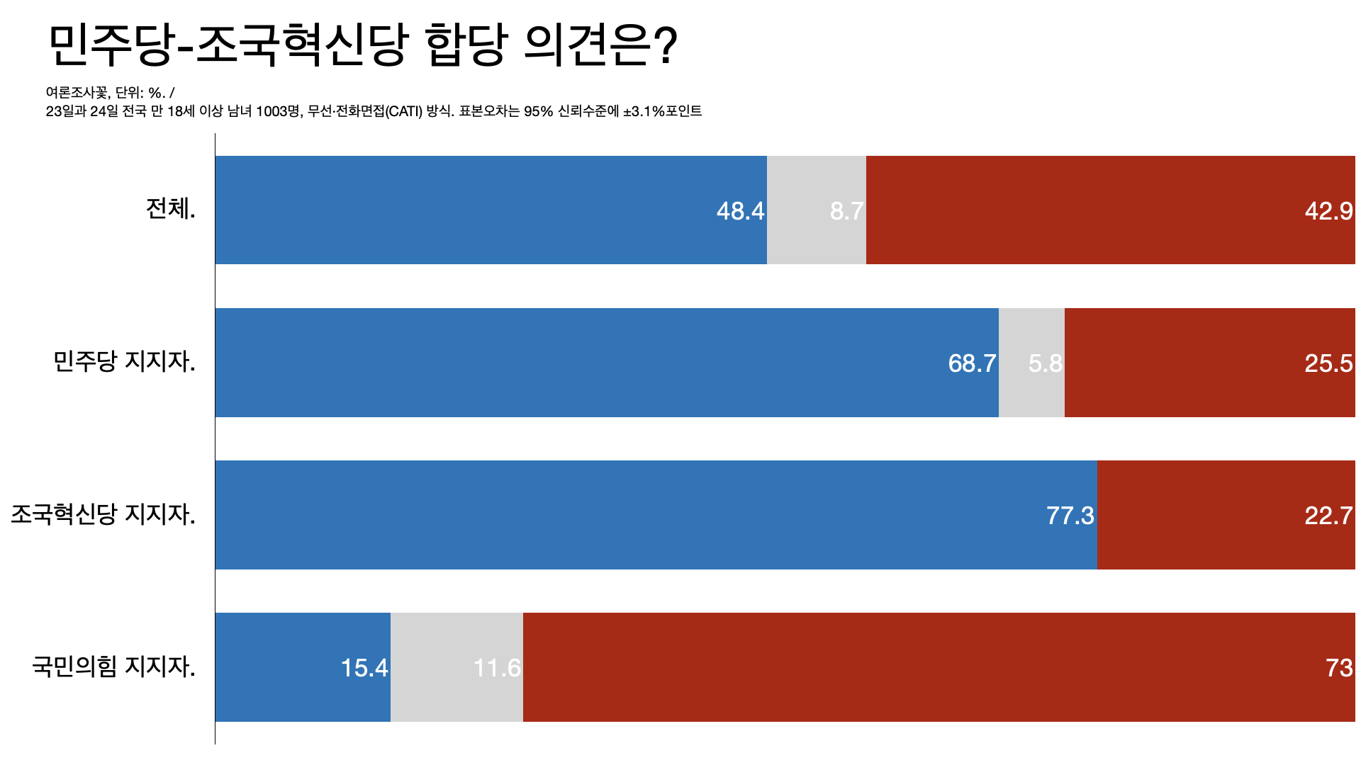 - 한국갤럽 조사에서는 민주당 지지자와 조국혁신당 지지자의 48%와 41%가 합당에 찬성했다.