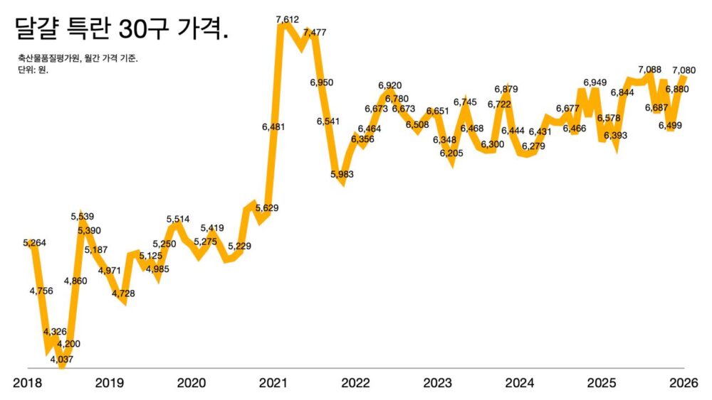 - 출산물품질평가원에 따르면 특란 30개 기준으로 7000원을 넘어선 것은 처음은 아니다. 2021년에는 7612원까지 오르기도 했다. 지난해 1월 6386원에서 올해 1월 7080원으로 11% 이상 올랐다.