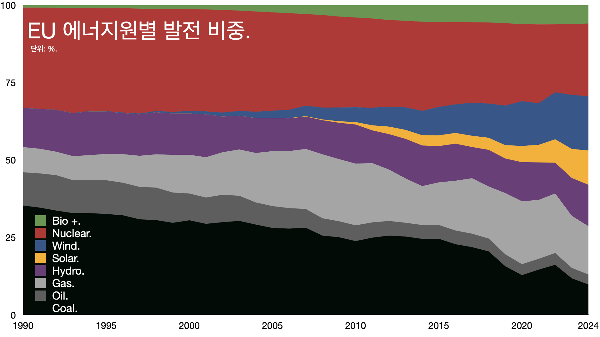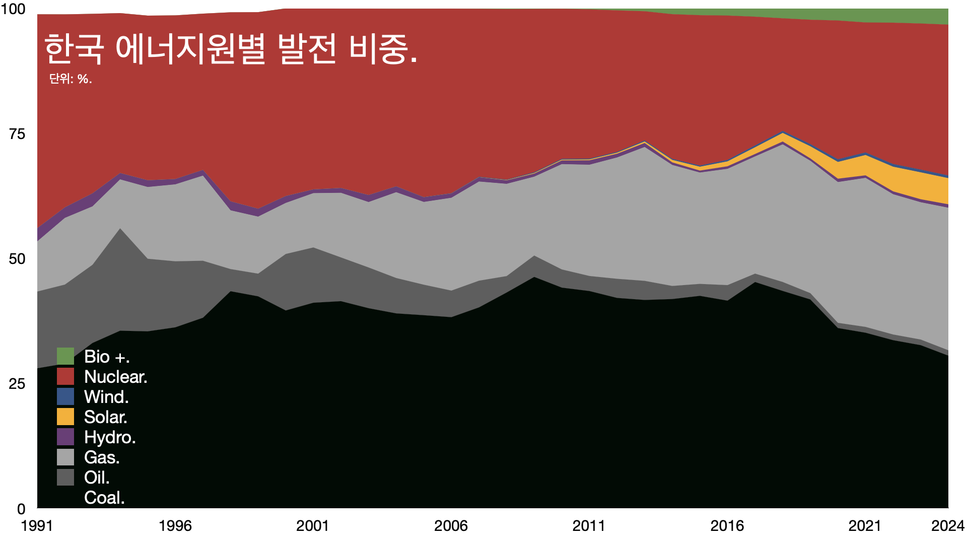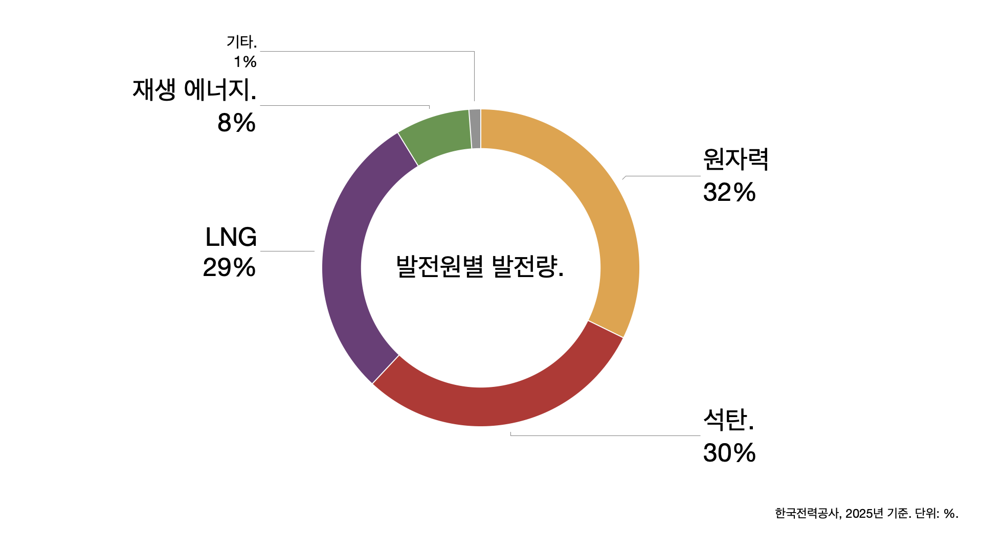 - 한국은 원자력과 석탄, LNG가 각각 30% 정도를 차지합니다. 재생 에너지 비율은 10%가 채 안 되죠.