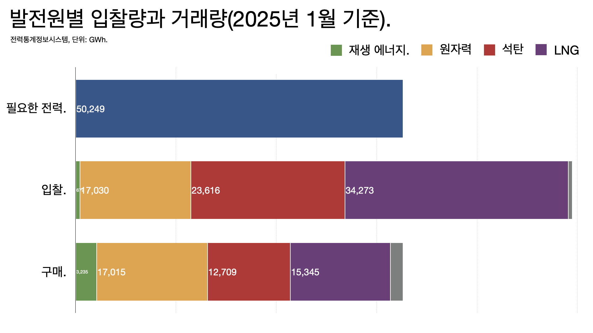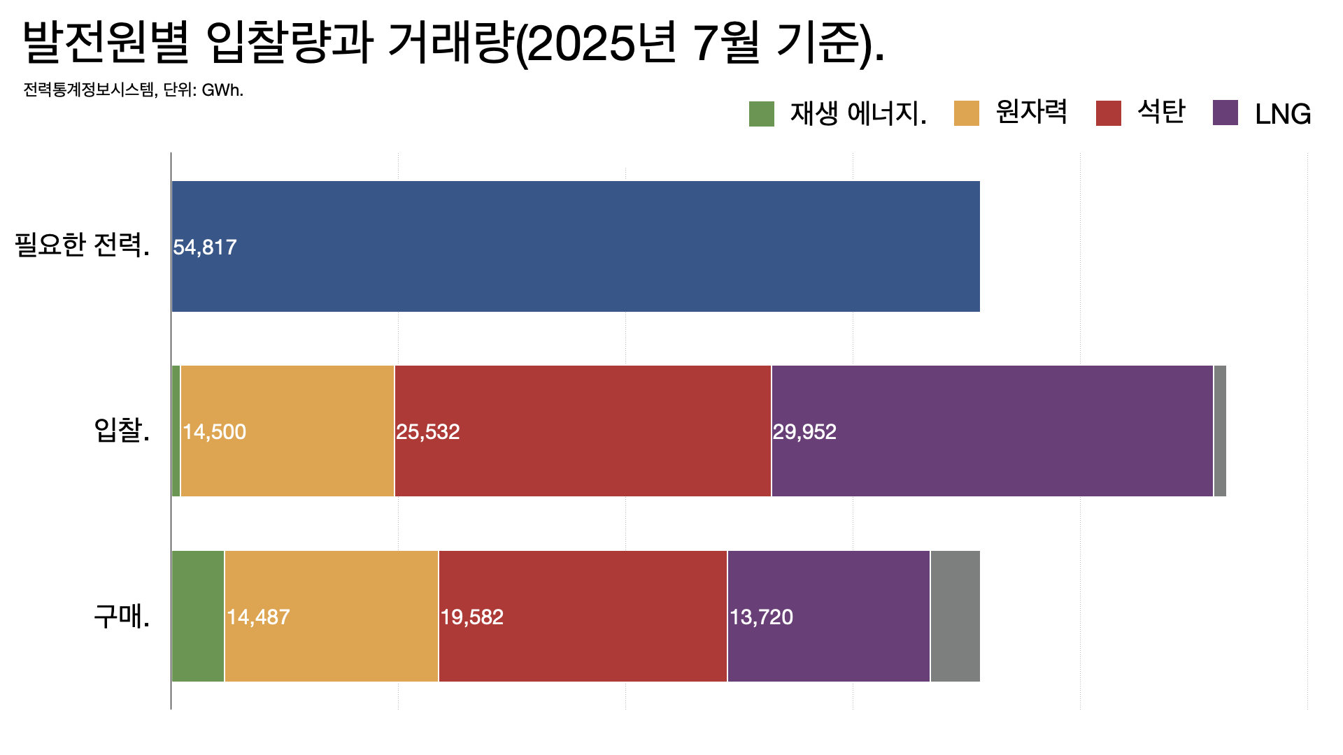 - 원칙적으로, 우리나라 전력시장은 연료비를 기준으로 어떤 발전기가 돌아갈지를 결정하기 때문에, 연료비가 없는 재생 에너지가 가장 먼저 팔리고 그 다음 원자력이 팔리고 나머지를 석탄과 LNG로 채우는 구조입니다.