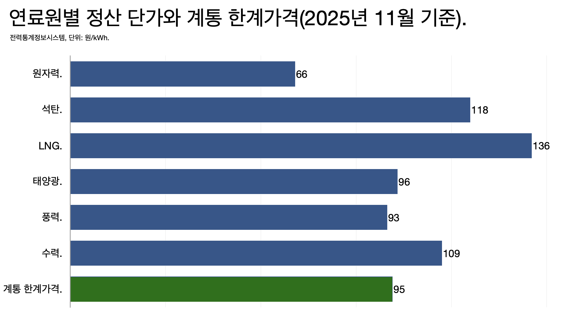 - 그런데 연료 가운데 LNG 가격이 가장 비싸기 때문에 계통 한계가격은 대부분 LNG 가격을 기준으로 결정됩니다. 가장 비싼 연료 가격이 전체 정산 단가를 결정하게 되죠. (나라마다 다릅니다. 발전사들이 가격을 정해 입찰하도록 하는 나라도 있습니다.)